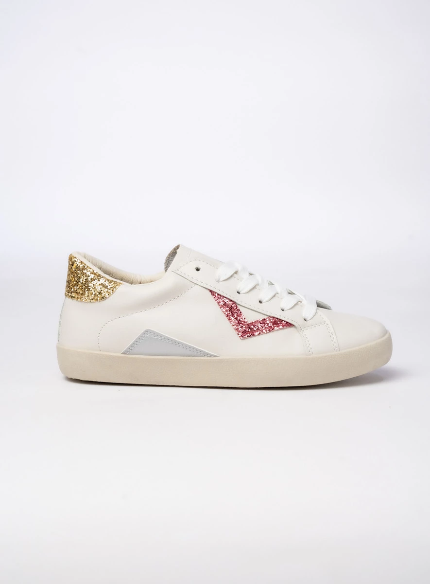 Sneakersy Sienna PEACHPUFF to stylowe połączenie wygody i subtelnego blasku. Wykonane z wysokiej jakości skóry ekologicznej, zapewniają trwałość i komfort noszenia przez cały dzień. Brokatowe różowe i złote wstawki dodają im kobiecego charakteru, a klasyczne sznurowanie gwarantuje idealne dopasowanie. Doskonałe do casualowych stylizacji, świetnie komponują się z jeansami i sukienkami, podkreślając ich wyjątkowy styl.