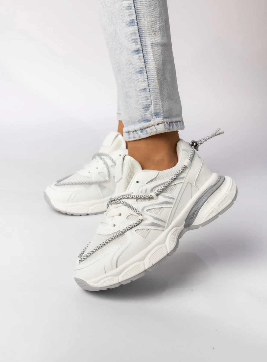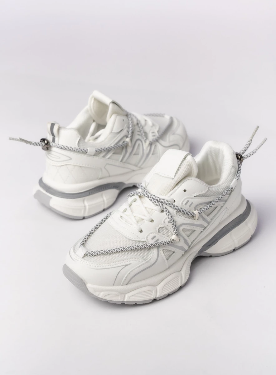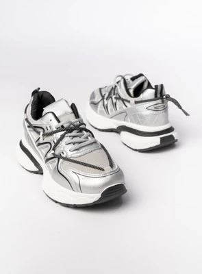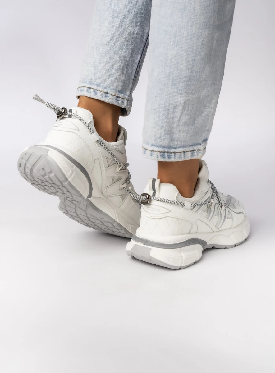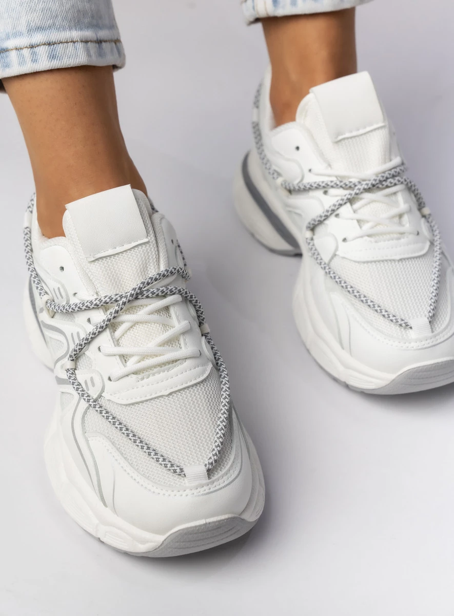 Sznurowane sneakersy – buty sportowe damskie. Najmodniejsza w tym sezonie masywna i ultranowoczesna podeszwa o wysokości 5 cm idealnie komponuje się z różnorodnymi dodatkami – błyszczącymi sznurówkami. Przekonaj się sama, jak dodadzą charakteru Twoim stylizacjom. Wnętrze butów wyścielone jest tkaniną.