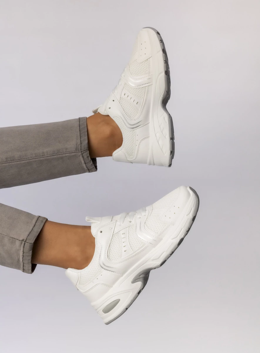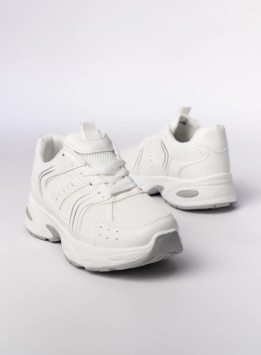 Sznurowane sneakersy – buty sportowe damskie. Najmodniejsza w tym sezonie masywna i ultranowoczesna podeszwa o wysokości 5 cm idealnie komponuje się z różnorodnymi dodatkami – przewiewną siateczką i dynamicznymi przeszyciami. Te buty to idealne połączenie stylu i wygody, sprawdzające się zarówno na co dzień, jak i podczas aktywnego dnia. Wnętrze butów wyścielone jest tkaniną.