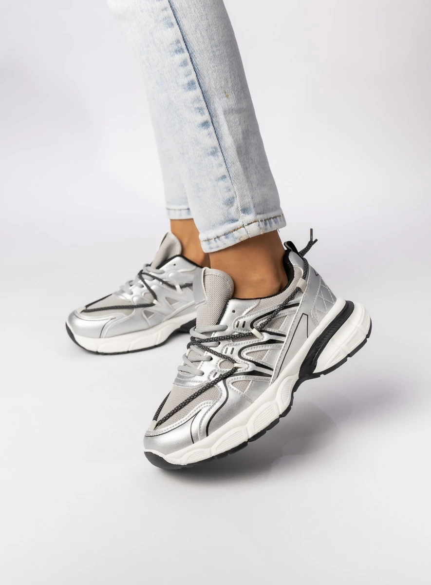 Sznurowane sneakersy – buty sportowe damskie. Najmodniejsza w tym sezonie. Idealnie komponuje się z elegancką, srebrną kolorystyką. Ich lekka konstrukcja i przewiewny materiał sprawiają, że są doskonałym wyborem na co dzień, a także do sportowych stylizacji. Wnętrze butów wyścielone jest tkaniną, co zapewnia maksymalny komfort użytkowania.