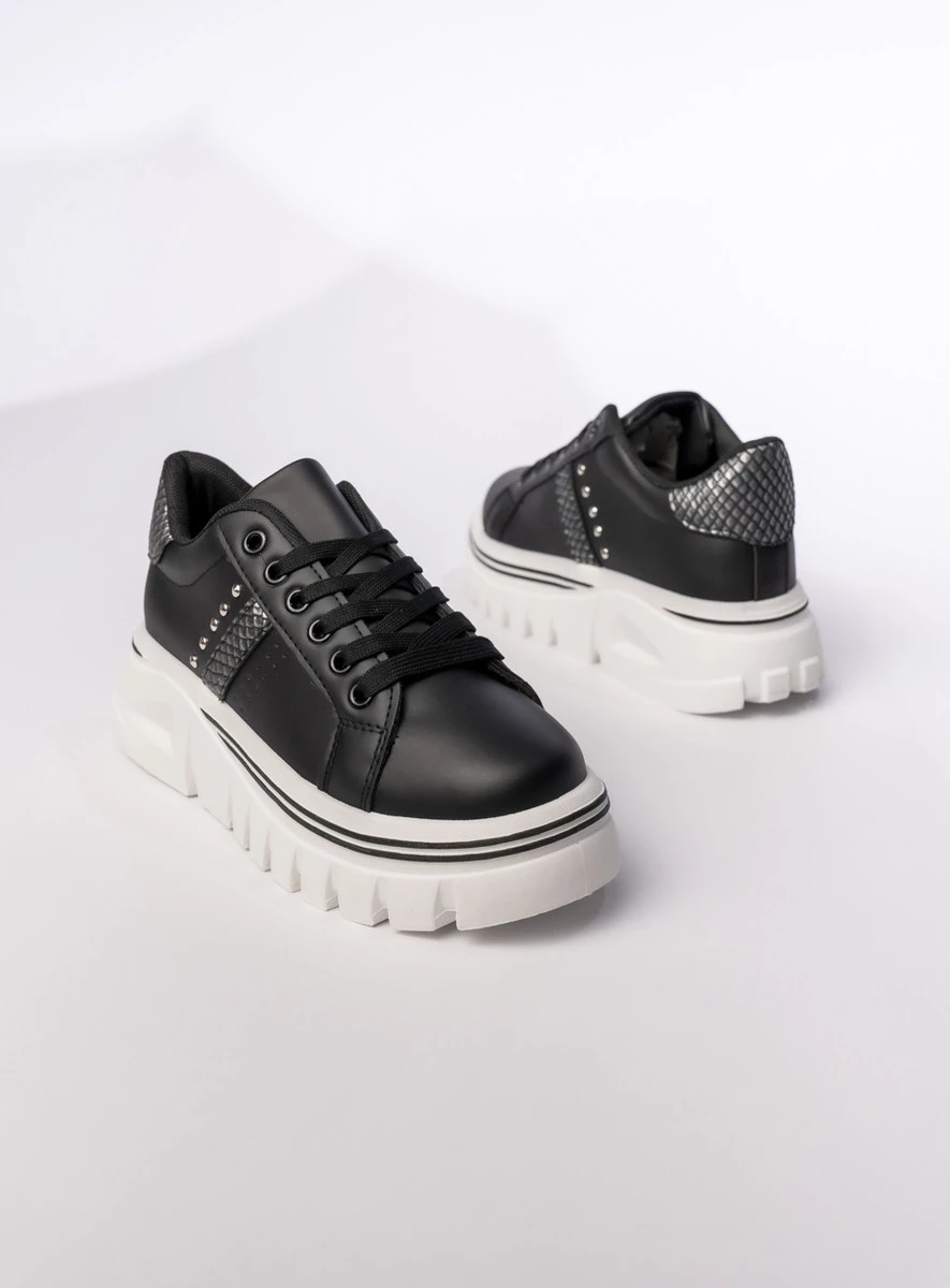 Sznurowane sneakersy – buty sportowe damskie. Doskonale komponuje się z czarnym, matowym wykończeniem i eleganckimi detalami. Srebrne zdobienia oraz teksturowane wstawki nadają butom wyjątkowego stylu. Idealne na co dzień i do casualowych stylizacji. Wnętrze butów wyścielone jest tkaniną, zapewniając komfort noszenia przez cały dzień.