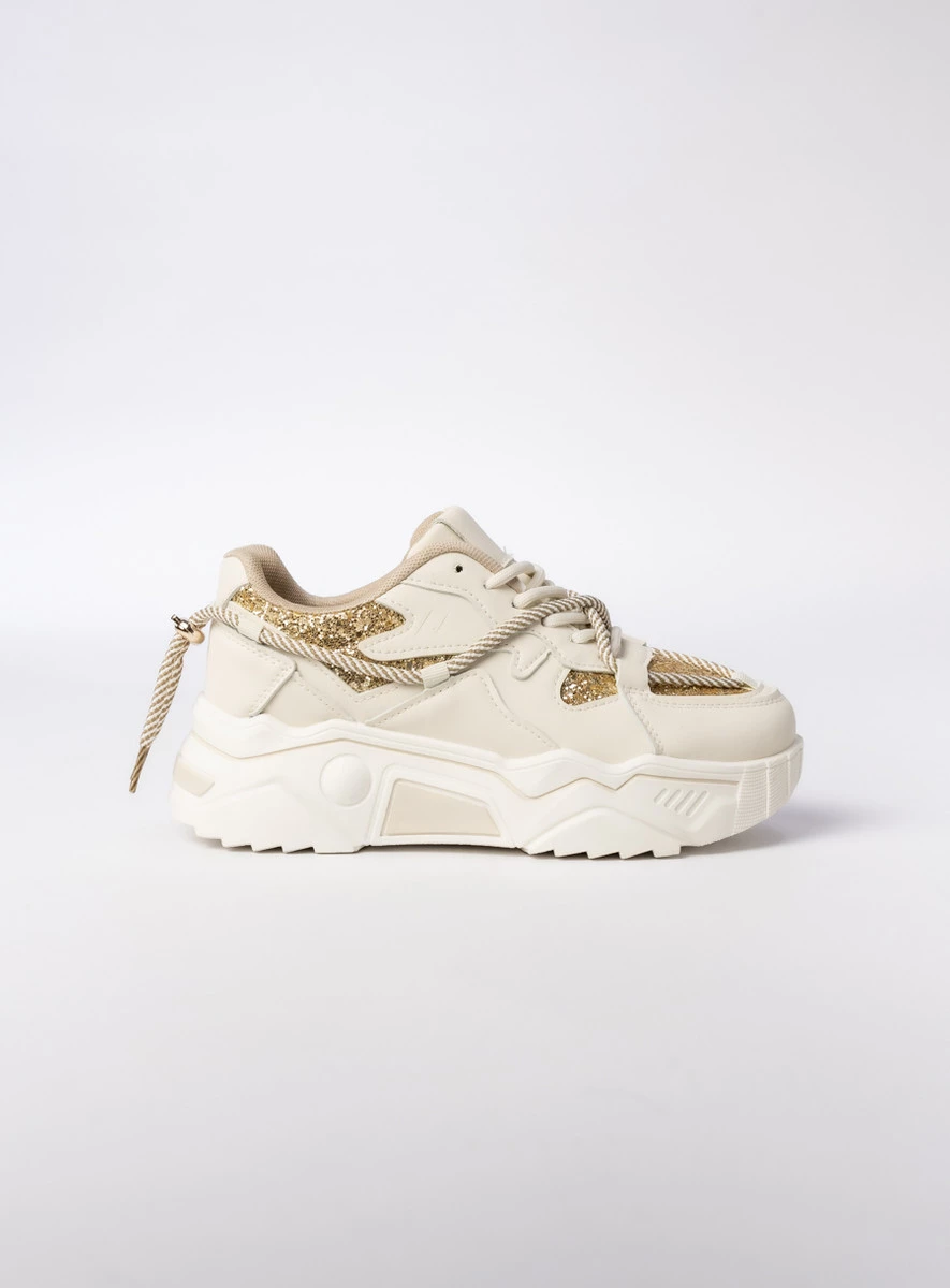 Sznurowane sneakersy – buty sportowe damskie. Najmodniejsza w tym sezonie. Doskonale komponuje się ze złotymi, błyszczącymi detalami, nadając wyjątkowego charakteru każdej stylizacji. Sneakersy wykonane z wysokiej jakości skóry ekologicznej i tkaniny gwarantują wygodę oraz doskonałe dopasowanie do stopy. Idealne zarówno na co dzień, jak i do modnych, streetwearowych outfitów.