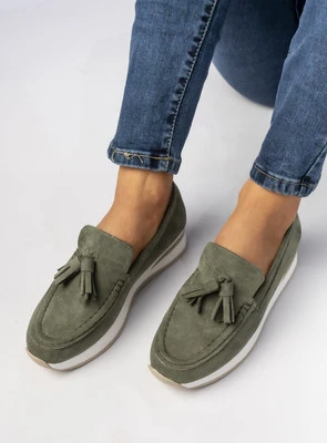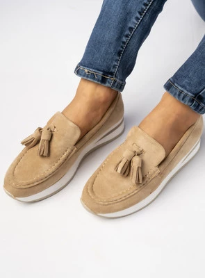Damskie mokasyny na platformie w eleganckim odcieniu pudrowego różu. Wykonane z wysokiej jakości zamszu, zapewniają miękkość i komfort użytkowania. Model wyróżnia się modnymi frędzlami na przodzie oraz lekką, elastyczną podeszwą, która dodaje im nowoczesnego charakteru. Idealne do codziennych oraz eleganckich stylizacji.