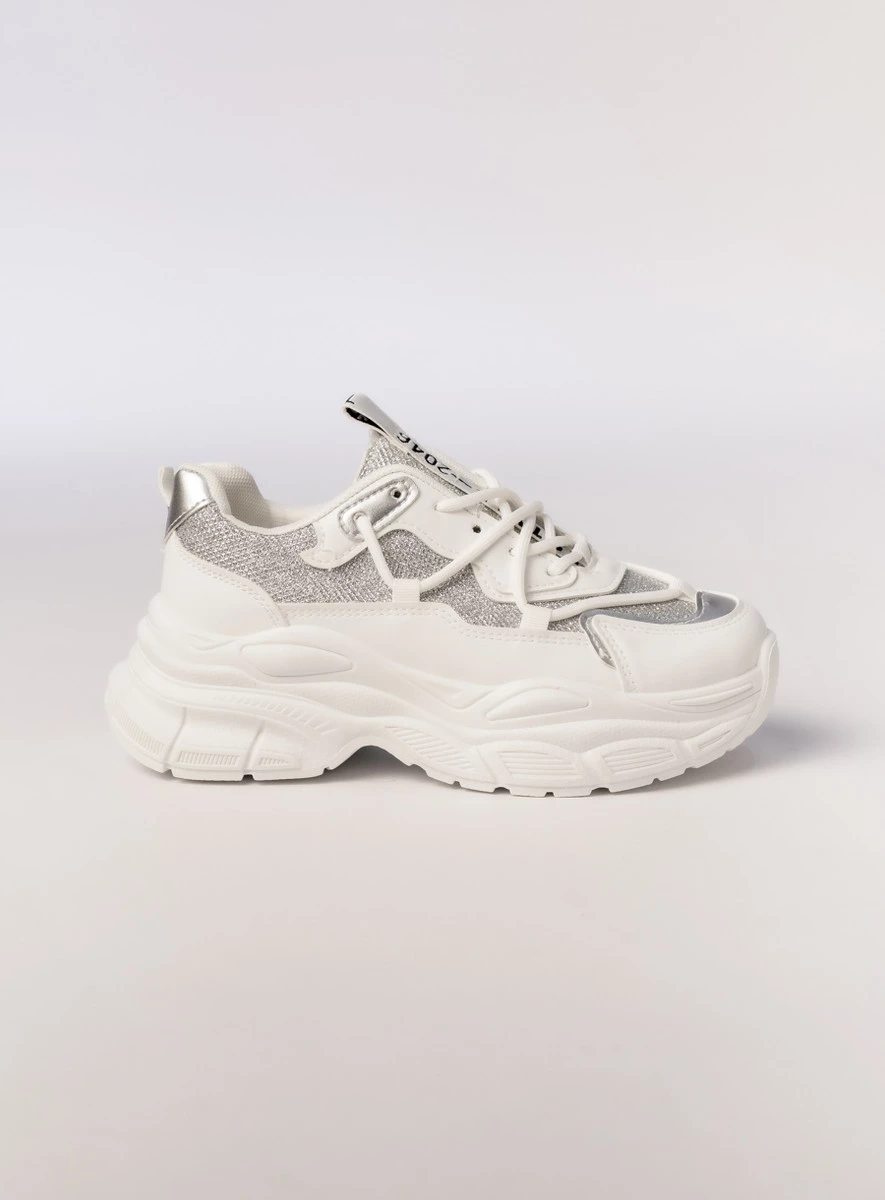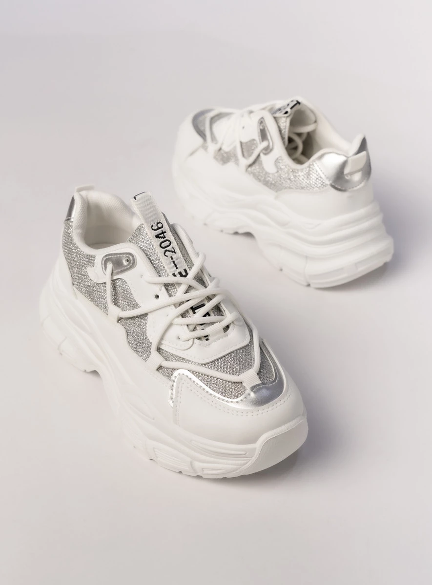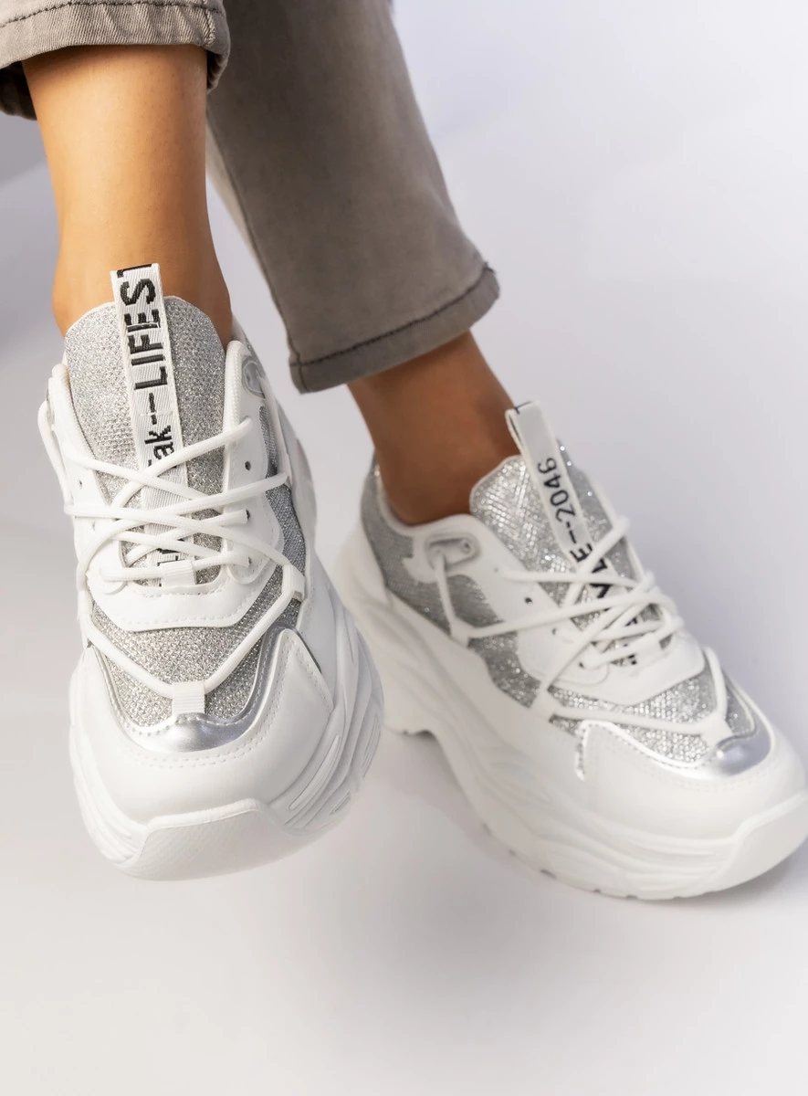 Modne i stylowe sneakersy na masywnej platformie w eleganckim, białym kolorze z subtelnymi srebrnymi akcentami. Ich sportowy design połączony z nowoczesnym wyglądem sprawia, że idealnie pasują do codziennych oraz streetwearowych stylizacji. Dzięki wygodnej, dobrze amortyzowanej podeszwie i przewiewnym materiałom zapewniają komfort przez cały dzień.
