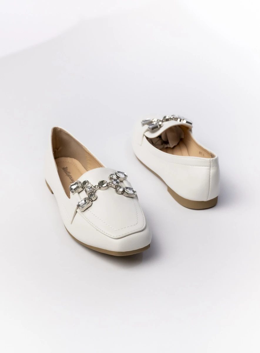 Damskie mokasyny ELEA w kolorze białym to kwintesencja elegancji i komfortu. Klasyczny fason został wzbogacony o efektowną metalową ozdobę, która nadaje im wyjątkowego charakteru. Idealne zarówno do codziennych, jak i bardziej eleganckich stylizacji. Dzięki wsuwanemu fasonowi buty są niezwykle wygodne i praktyczne.