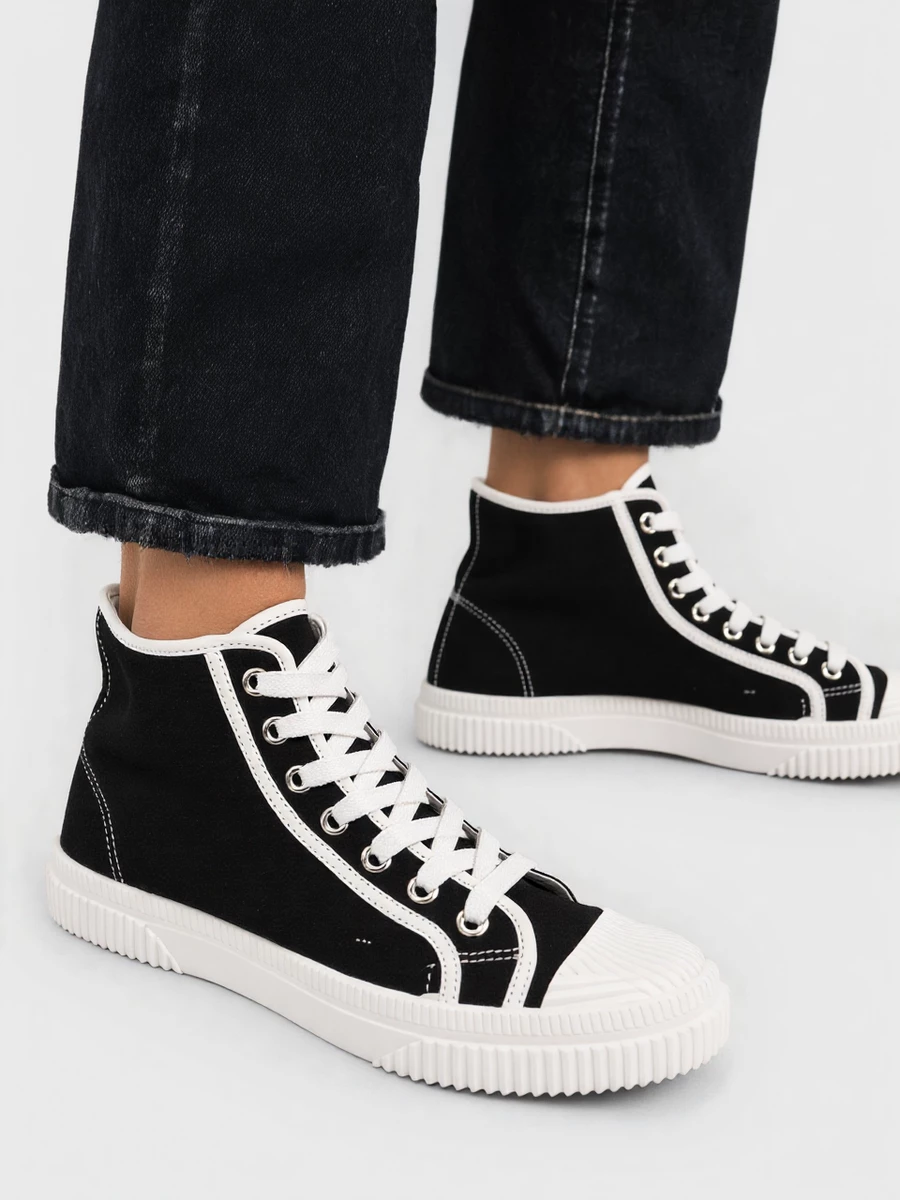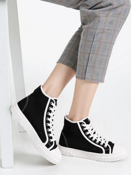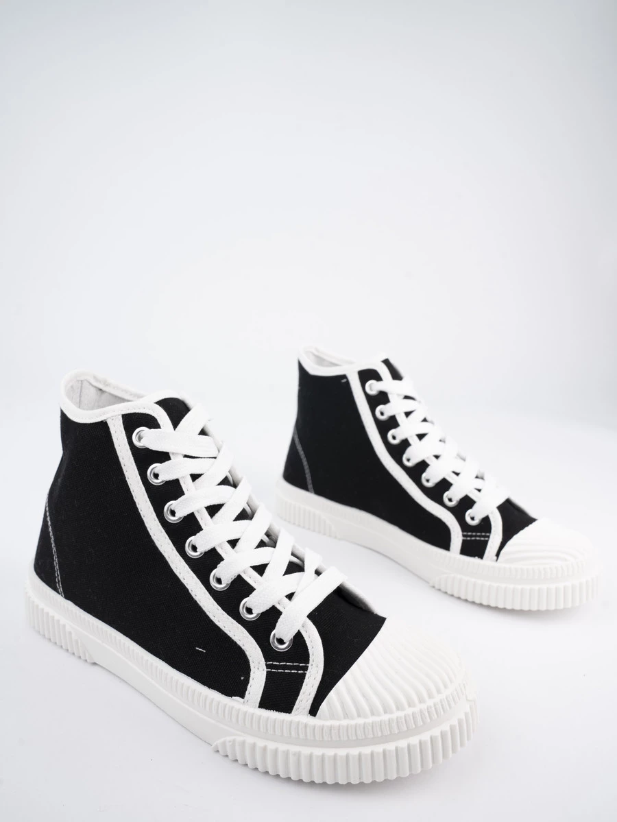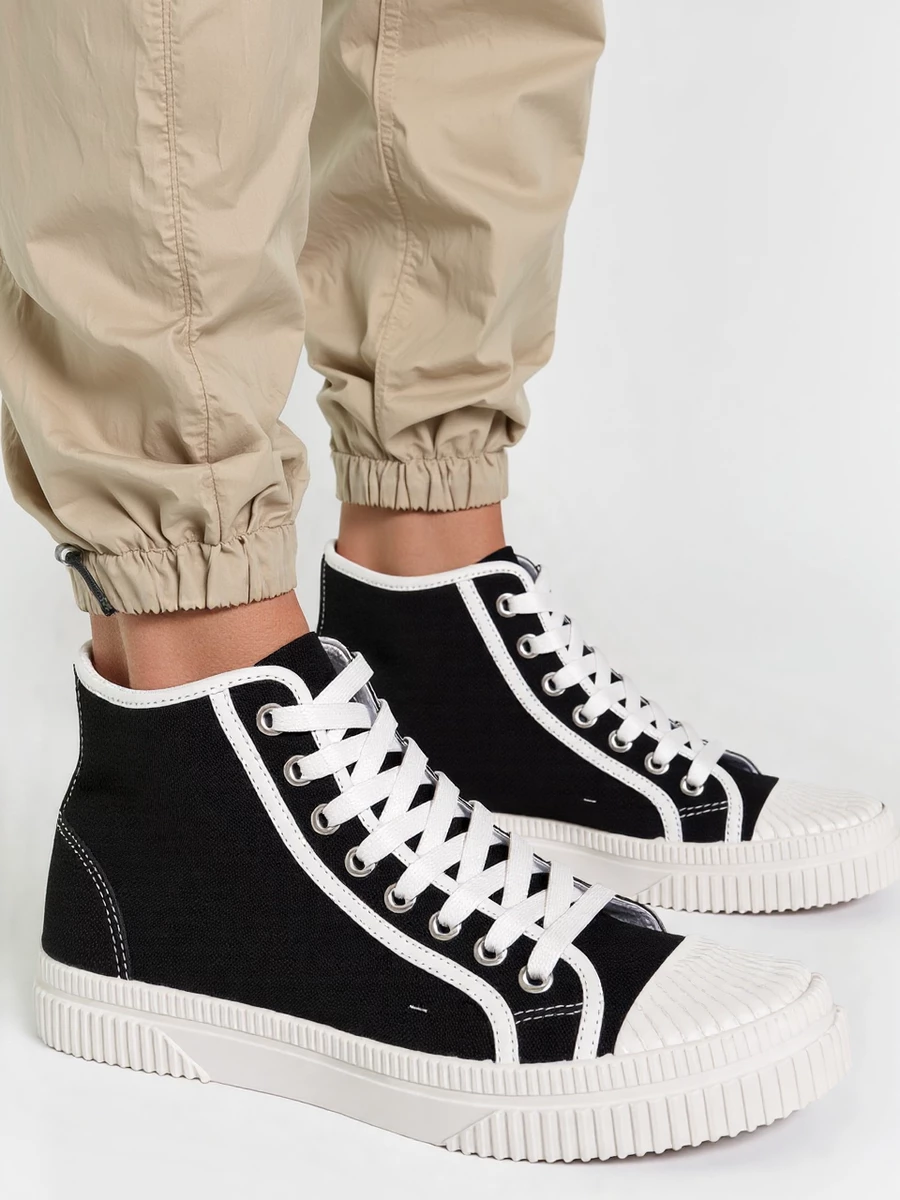 VELORA BLACK to klasyczne czarno-białe trampki o ponadczasowym designie. Dzięki wygodnej, grubej podeszwie oraz solidnym materiałom świetnie sprawdzą się na co dzień. Sznurowane z przodu, zapewniają idealne dopasowanie do stopy. To doskonały wybór dla kobiet ceniących wygodę i streetwearowy styl.