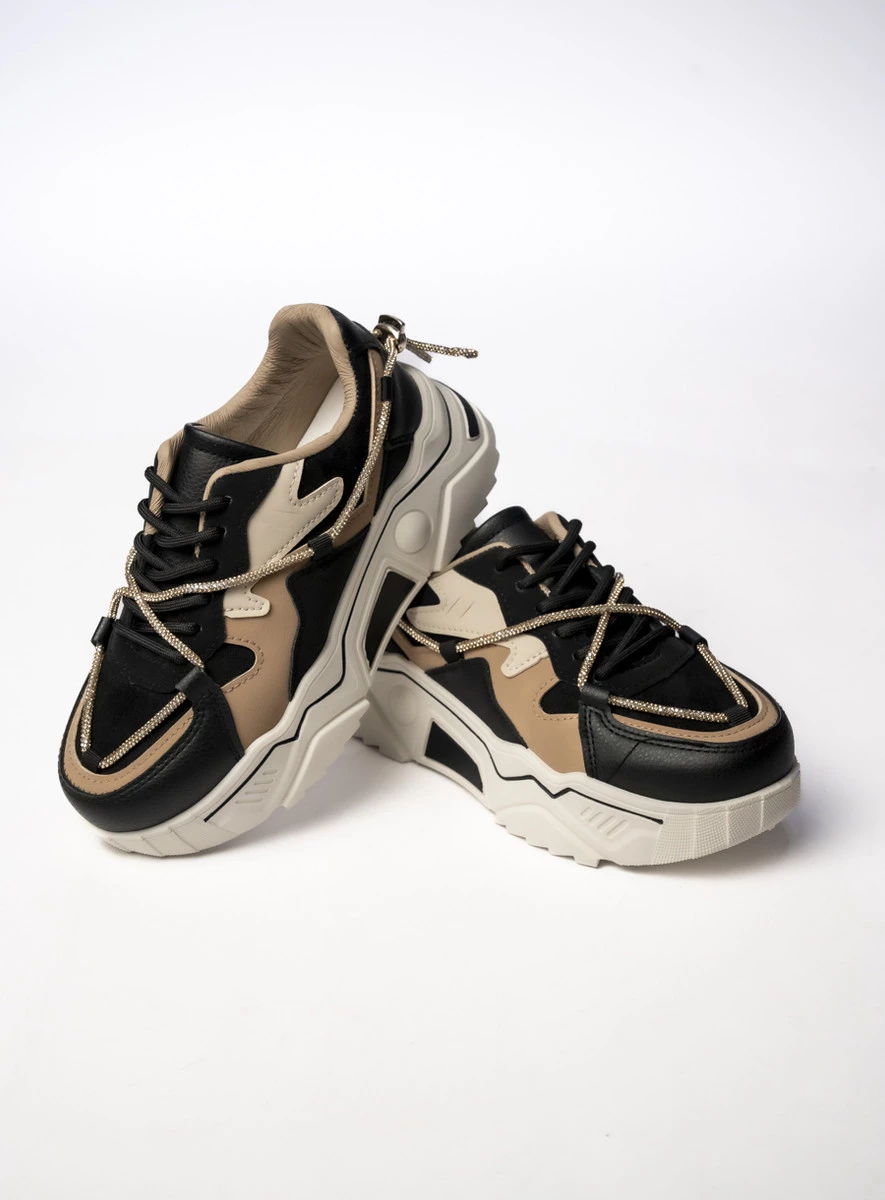 VEYRA BLACK  to wyjątkowe sneakersy, które łączą sportowy styl z odważnym designem. Kontrastowe panele w odcieniach czerni i beżu, ozdobne złote sznurowadła oraz masywna podeszwa sprawiają, że te buty przyciągają wzrok i dodają charakteru każdej stylizacji. Dzięki ergonomicznemu kształtowi i solidnej amortyzacji są idealnym wyborem na co dzień.