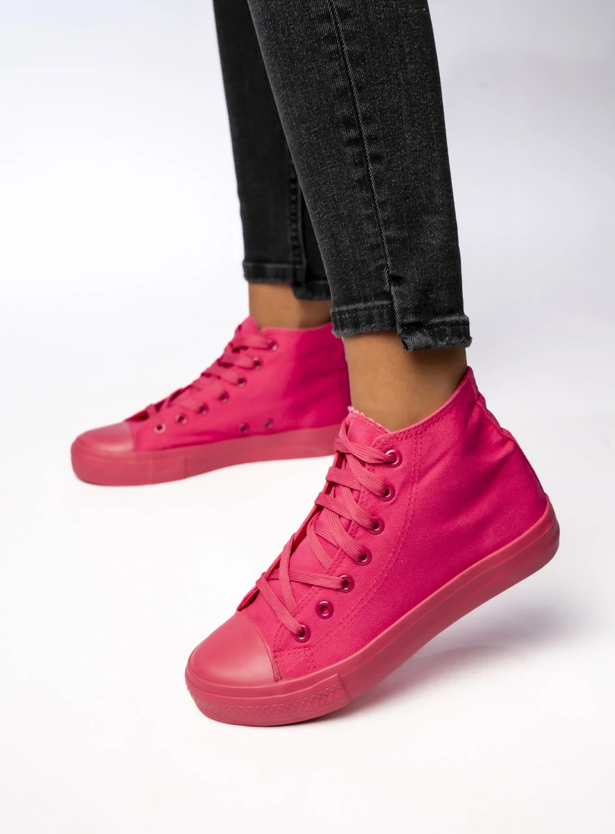 AURORA FUCHSIA to odważne i stylowe trampki dla kobiet, które kochają wyróżniać się w tłumie! Intensywny fuksjowy kolor w połączeniu z wysoką cholewką nadaje im unikalnego charakteru, idealnego na każdą casualową stylizację. Wykonane z lekkiej, oddychającej tkaniny, gwarantują komfort przez cały dzień. Gumowa podeszwa zapewnia stabilność i trwałość, dzięki czemu są idealne zarówno na miasto, jak i na długie spacery.