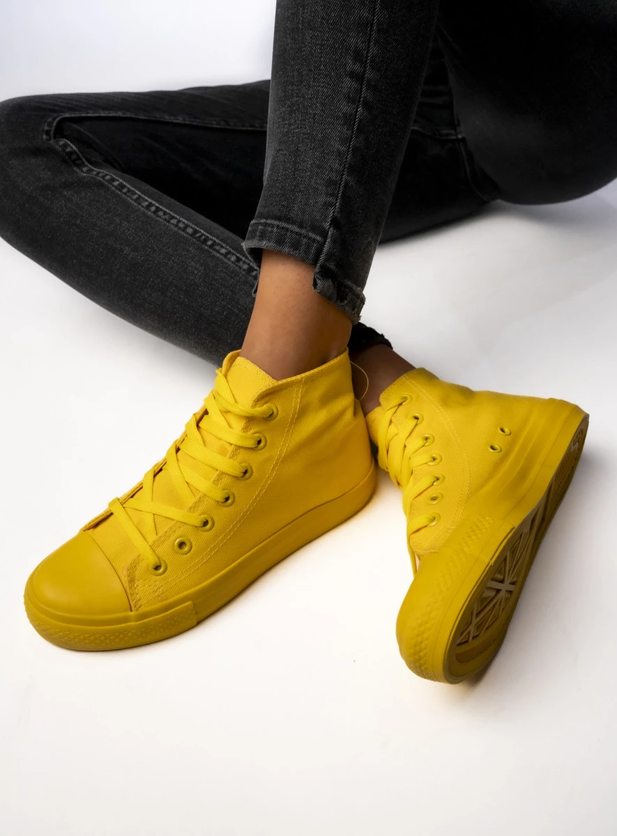 SOLIS YELLOW to trampki stworzone dla kobiet, które nie boją się wyróżniać! Ich energetyczny, słoneczny odcień żółci sprawia, że każda stylizacja nabiera wyjątkowego charakteru. Dzięki klasycznemu fasonowi i wysokiej cholewce, są doskonałym wyborem na co dzień – idealne do miejskiego stylu, casualowych outfitów i luźnych, sportowych zestawień. Wykonane z trwałego materiału, z antypoślizgową gumową podeszwą, gwarantują wygodę i stabilność przez cały dzień.