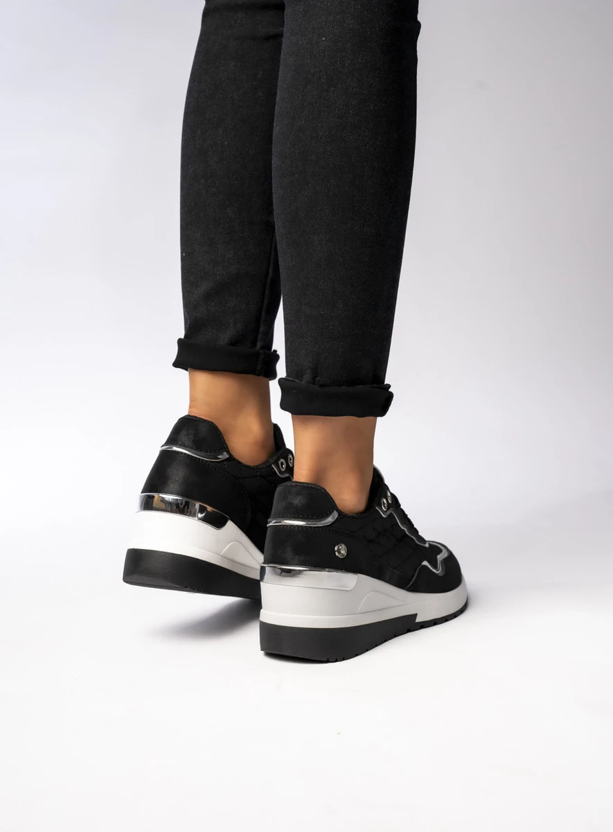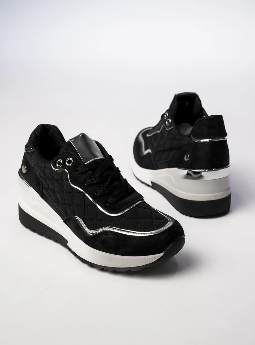VELTARA BLACK to sneakersy dla kobiet, które cenią elegancję połączoną z wygodą. Klasyczna czerń wzbogacona srebrnymi akcentami nadaje im luksusowego charakteru, a pikowane detale dodają wyrafinowanego stylu. Dzięki podwyższonej podeszwie zapewniają dodatkowy komfort i subtelne wydłużenie sylwetki. Doskonale sprawdzą się zarówno w sportowych, jak i casualowych stylizacjach.
