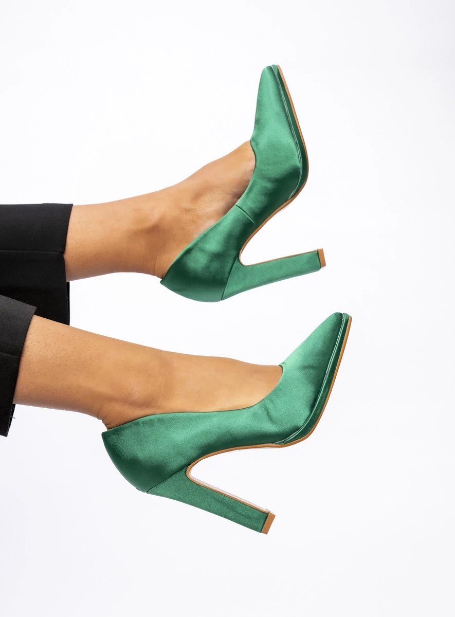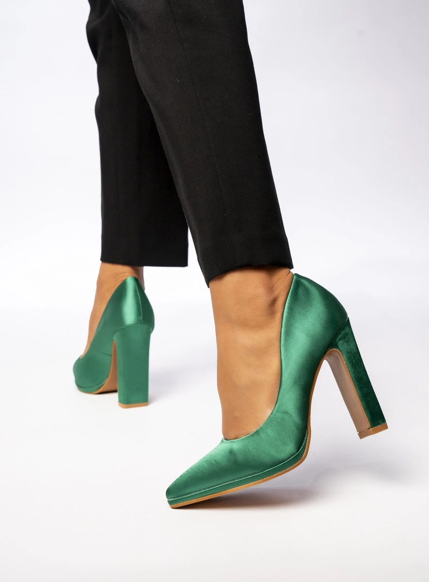 LAVANA GREEN to eleganckie czółenka na wysokim słupku, wyróżniające się luksusowym, zielonym kolorem i satynowym wykończeniem. Idealne na wieczorne wyjścia, formalne okazje oraz eleganckie stylizacje. Klasyczny szpiczasty nosek i stabilny obcas zapewniają zarówno szyk, jak i wygodę noszenia przez cały dzień.
