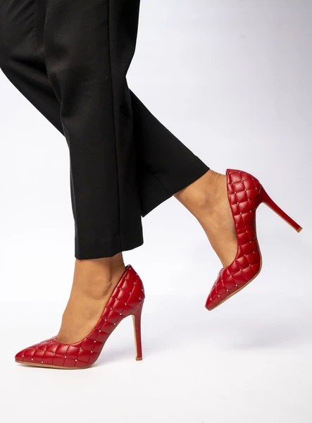 LUMORA RED to wyjątkowe szpilki dla kobiet, które chcą podkreślić swój styl elegancją i luksusem. Ich intensywnie czerwony kolor w połączeniu z pikowaną fakturą i metalowymi akcentami dodaje im ekskluzywnego charakteru. Szpiczasty nosek i smukła szpilka pięknie modelują nogę, dodając pewności siebie. To doskonały wybór na wyjątkowe okazje, wieczorne wyjścia i eleganckie spotkania.