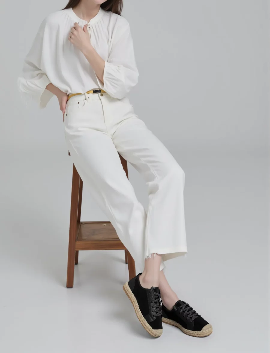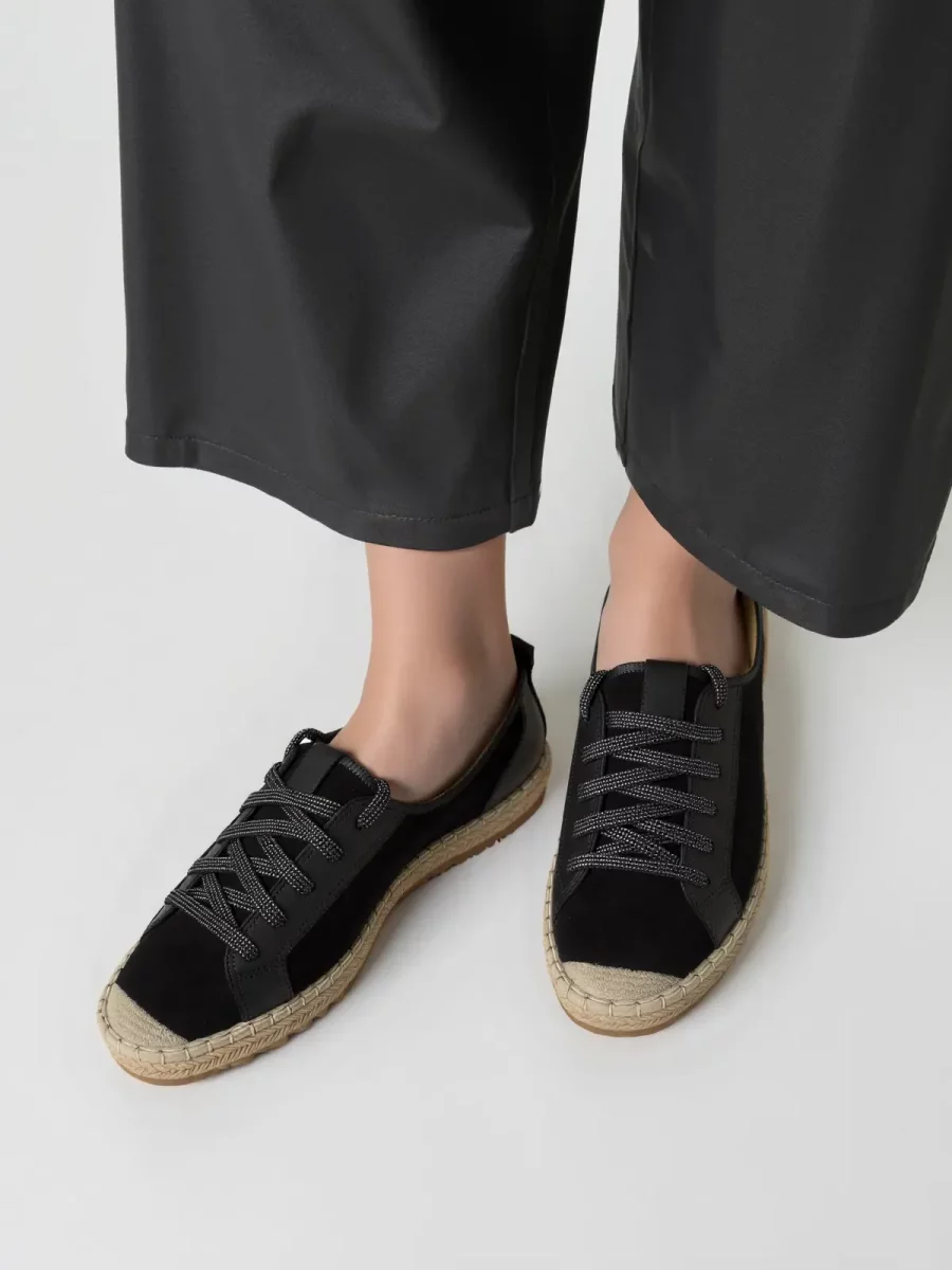 NOIR LACE BLACK to stylowe espadryle w klasycznym czarnym kolorze, które łączą wygodę i elegancję. Wykonane z miękkiej skóry ekologicznej, z ozdobnym sznurowaniem i plecioną podeszwą w stylu boho. Idealne na letnie dni, pasujące zarówno do codziennych, jak i bardziej eleganckich stylizacji.