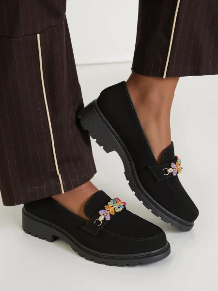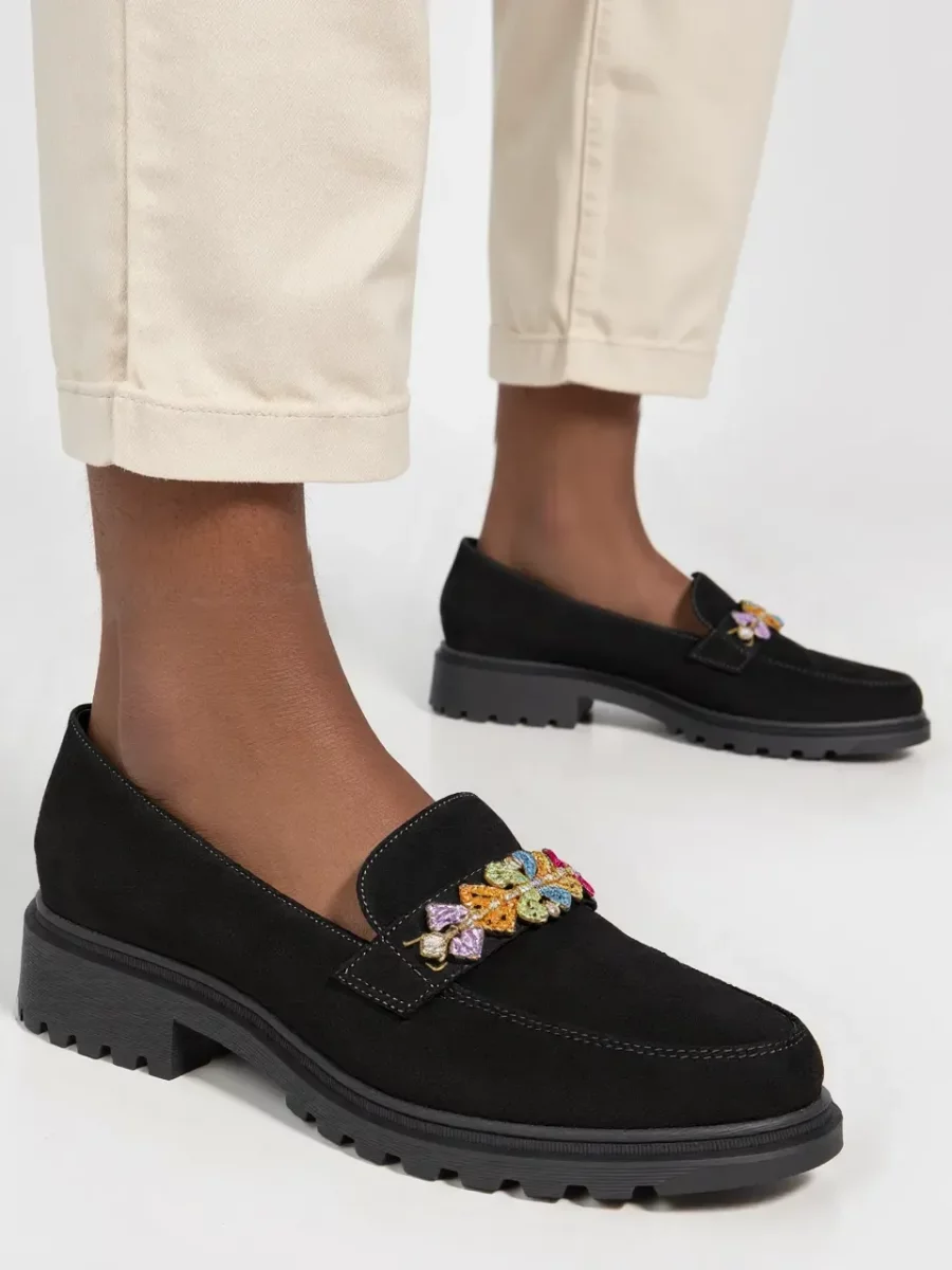 Damskie mokasyny ORNELLA BLACK to elegancka i stylowa propozycja dla kobiet ceniących wygodę i nowoczesny design. Czarna kolorystyka sprawia, że buty są niezwykle uniwersalne i pasują zarówno do codziennych, jak i bardziej formalnych stylizacji. Efektowne zdobienia w postaci kolorowych kamieni dodają im subtelnej elegancji. Wykonane z wysokiej jakości zamszu ekologicznego, gwarantują komfort przez cały dzień. Solidna podeszwa zapewnia stabilność i trwałość.