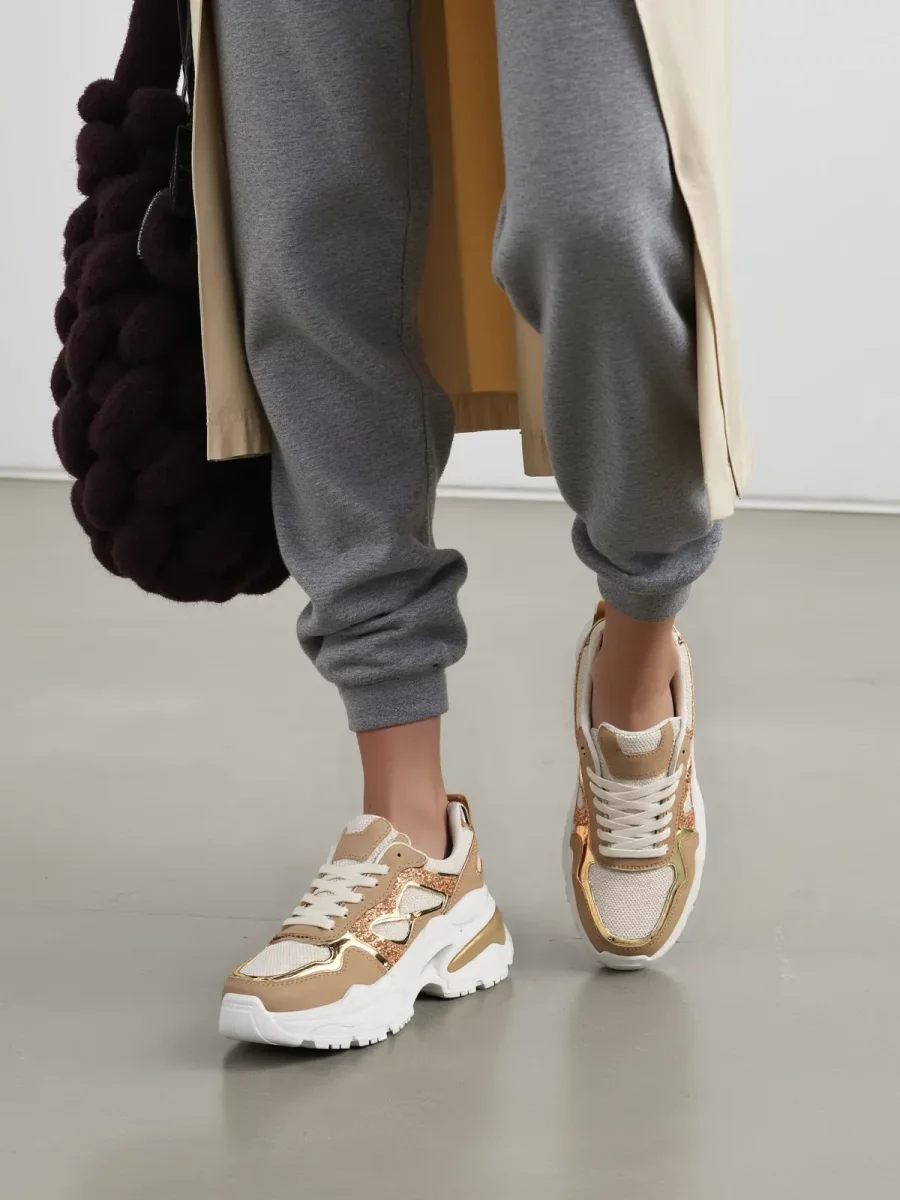 Sneakersy GLAM KHAKI to wyjątkowe połączenie sportowej wygody i modowego szyku. Model wyróżnia się błyszczącymi zdobieniami oraz siateczkowymi wstawkami, które zapewniają doskonałą wentylację. Gruba, ergonomiczna podeszwa gwarantuje stabilność i komfort noszenia przez cały dzień. Kolor khaki nadaje butom unikalnego charakteru i sprawia, że świetnie komponują się zarówno z casualowymi, jak i sportowymi stylizacjami.