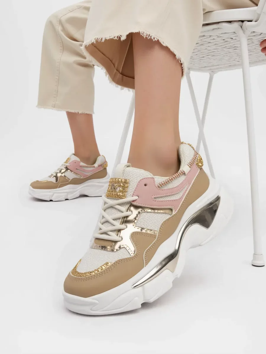 Damskie sneakersy LUNA BEIGE to połączenie nowoczesnego designu i wyjątkowej wygody. Beżowa kolorystyka z błyszczącymi złotymi detalami dodaje im elegancji, dzięki czemu sprawdzą się zarówno w codziennych, jak i bardziej stylowych stylizacjach. Cholewka wykonana z wysokiej jakości materiału tekstylnego i skóry ekologicznej zapewnia przewiewność oraz komfort noszenia przez cały dzień. Solidna, lekka podeszwa amortyzuje każdy krok, gwarantując wygodę na najwyższym poziomie.