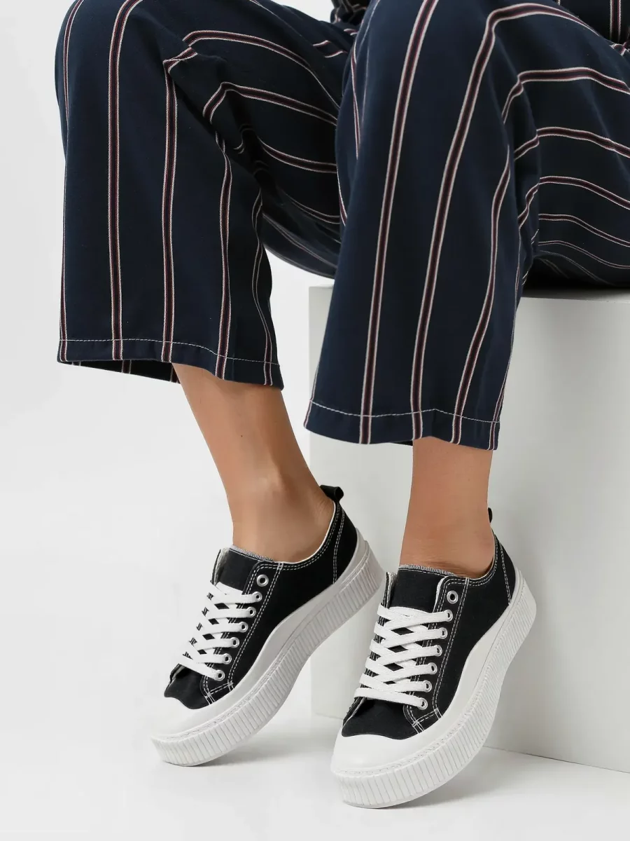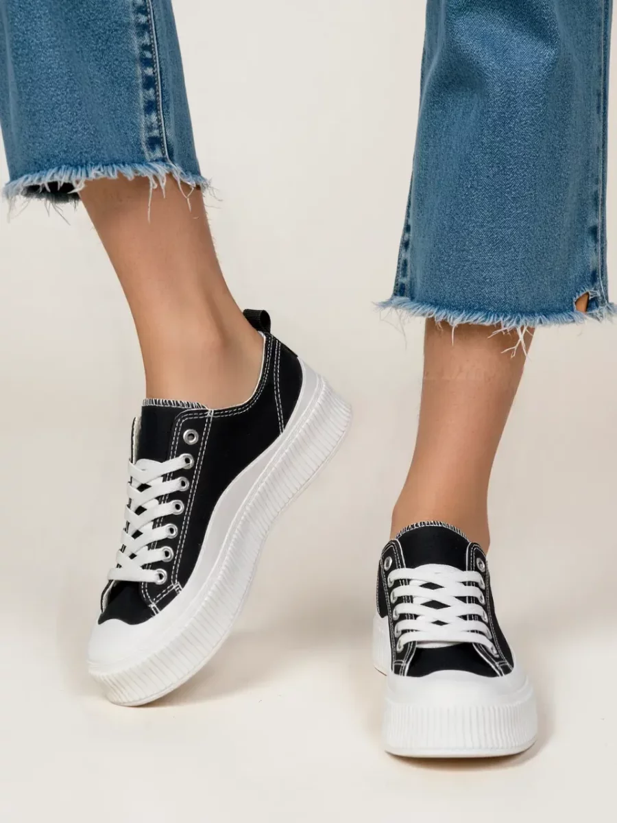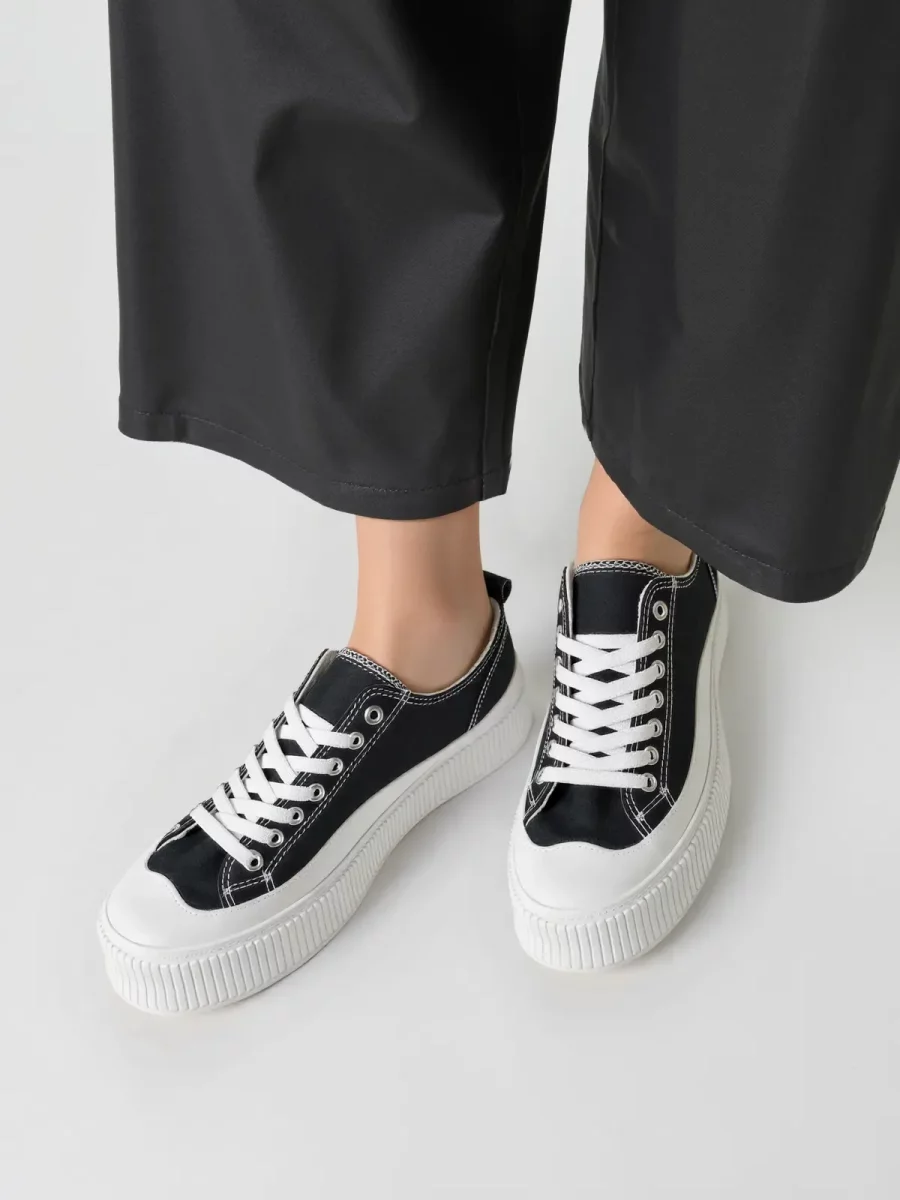 Damskie sneakersy RIFT BLACK to minimalistyczny model z nowoczesnym akcentem. Czarne płócienne wykończenie podkreślone białymi przeszyciami nadaje im surowego, miejskiego charakteru. Gruba, biała podeszwa z wyrazistym żłobieniem zapewnia komfort i stabilność na co dzień. Dzięki klasycznemu sznurowaniu i lekkiej konstrukcji są doskonałym wyborem do casualowych stylizacji.