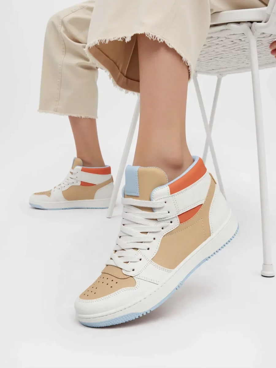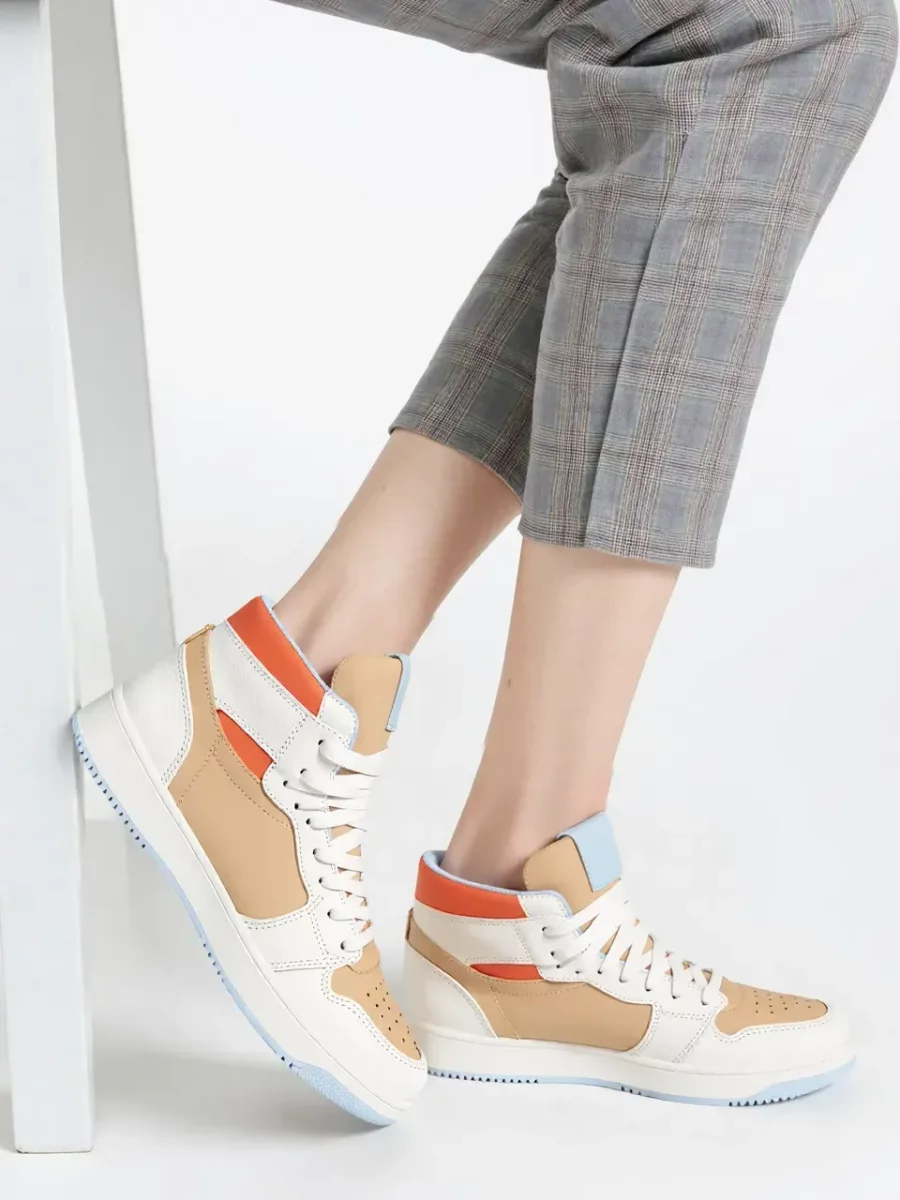 Damskie sneakersy VELTOR WHITE/KHAKI to nowoczesne połączenie stylu streetwearowego i sportowej wygody. Kontrastowe zestawienie bieli z khaki oraz subtelne kolorowe detale nadają im unikalnego charakteru. Wysoka cholewka i solidne sznurowanie zapewniają doskonałe dopasowanie oraz komfort podczas noszenia. Gruba, antypoślizgowa podeszwa dodaje stabilności i sprawia, że buty świetnie sprawdzą się na co dzień.