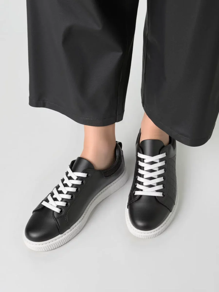 Te stylowe sneakersy to połączenie wygody i nowoczesnego designu. Czarne buty o minimalistycznym kroju świetnie sprawdzą się zarówno na co dzień, jak i do bardziej casualowych stylizacji. Dzięki solidnemu wykonaniu z wysokiej jakości materiałów gwarantują komfort noszenia przez cały dzień. Sznurowane z białą kontrastową podeszwą, dodają klasycznego, ale modnego akcentu.
