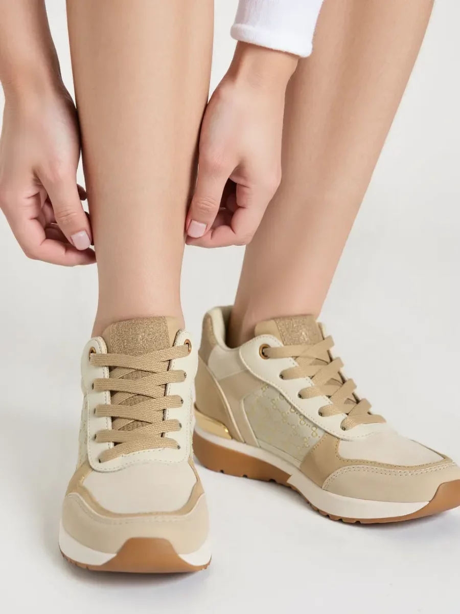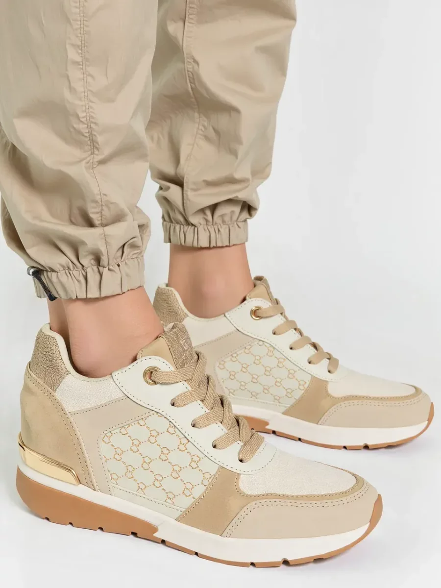 Eleganckie i wygodne damskie sneakersy w odcieniach beżu to idealne połączenie stylu i komfortu. Dzięki modnemu designowi oraz wysokiej jakości wykonania doskonale sprawdzą się na co dzień, zapewniając wygodę przez cały dzień. Subtelne złote detale dodają im wyjątkowego charakteru, a solidna podeszwa gwarantuje stabilność i wygodę.
