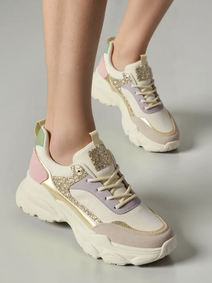 Damskie sneakersy GLIMMER MIX to wyjątkowe połączenie sportowego stylu i błyszczącej elegancji. Wykonane z połączenia materiału tekstylnego, zamszu i skóry ekologicznej, gwarantują wygodę oraz niepowtarzalny wygląd. Złote i brokatowe detale dodają im luksusowego charakteru, a pastelowe akcenty w odcieniach beżu, różu i zieleni sprawiają, że buty wyróżniają się na tle innych modeli. Wysoka, profilowana podeszwa zapewnia wygodę i amortyzację na każdym kroku. Idealne dla kobiet, które chcą dodać swoim stylizacjom odrobiny blasku.