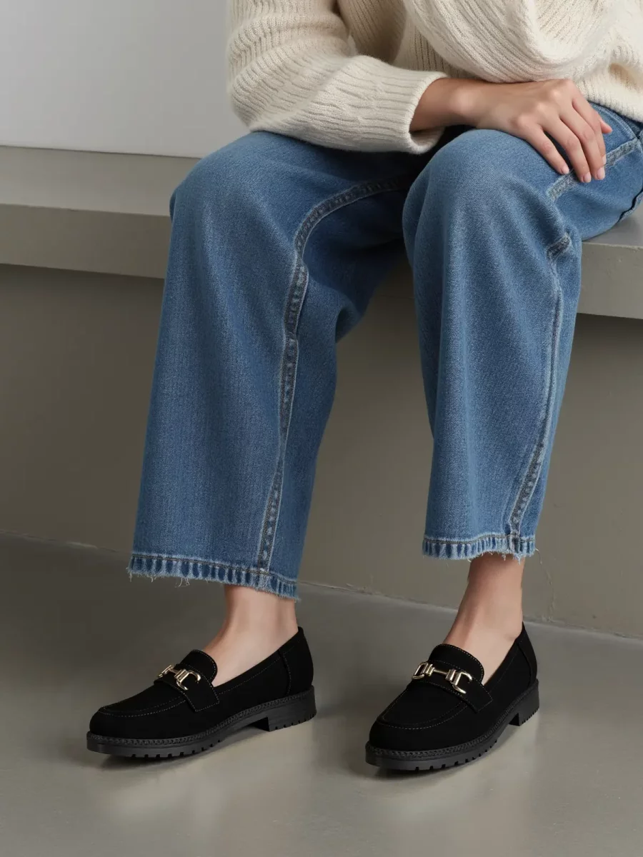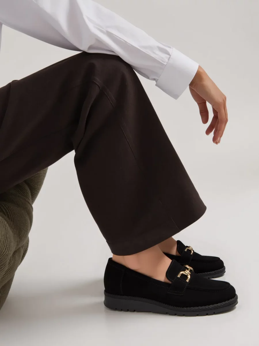 Eleganckie mokasyny damskie w ciepłym odcieniu black, ozdobione złotą sprzączką. Ich perforowana faktura dodaje im lekkości i nowoczesnego wyglądu, a wygodna podeszwa z ozdobnym przeszyciem gwarantuje komfort noszenia przez cały dzień. Idealne na co dzień i do casualowych stylizacji.