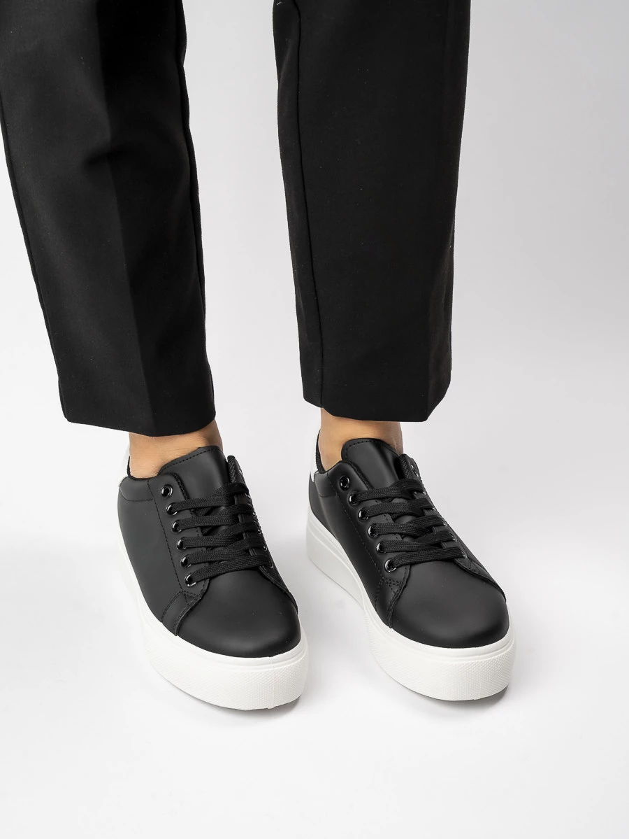 • Czarne sneakersy z białymi akcentami dla codziennego komfortu i stylu.