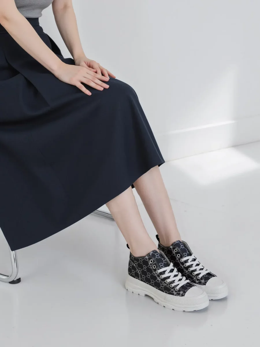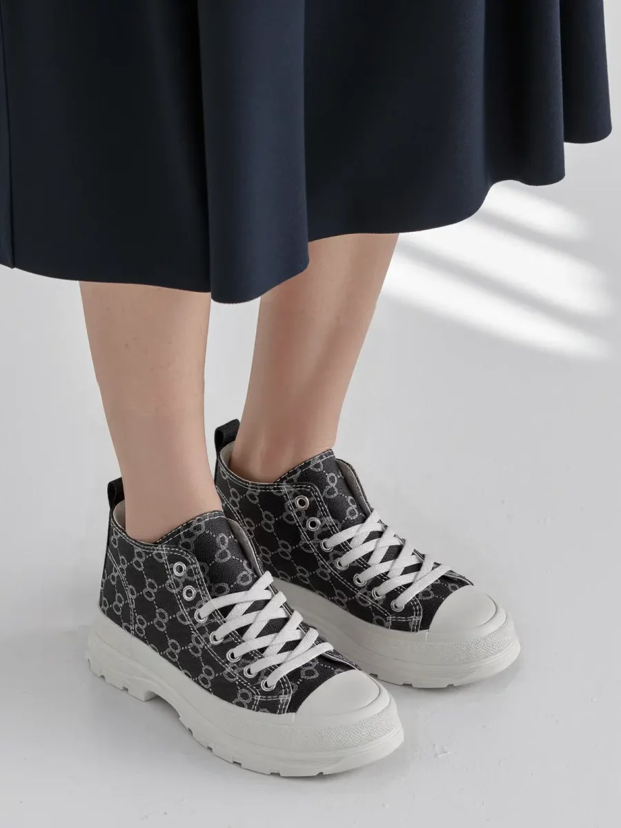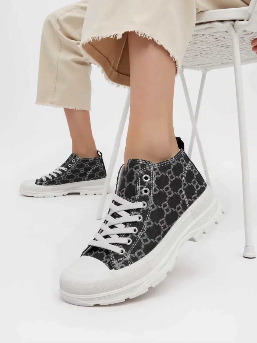 Damskie trampki SAVONA BLACK to wyjątkowe połączenie klasyki i nowoczesnego designu. Cholewka wykonana z materiału tekstylnego z eleganckim, geometrycznym wzorem, podkreśla ich unikalny styl. Kontrastowa, gruba podeszwa w kolorze białym nadaje im charakteru i zapewnia świetną amortyzację. Metalowe oczka i białe sznurówki dodają całości subtelnej elegancji, czyniąc ten model doskonałym wyborem na co dzień.