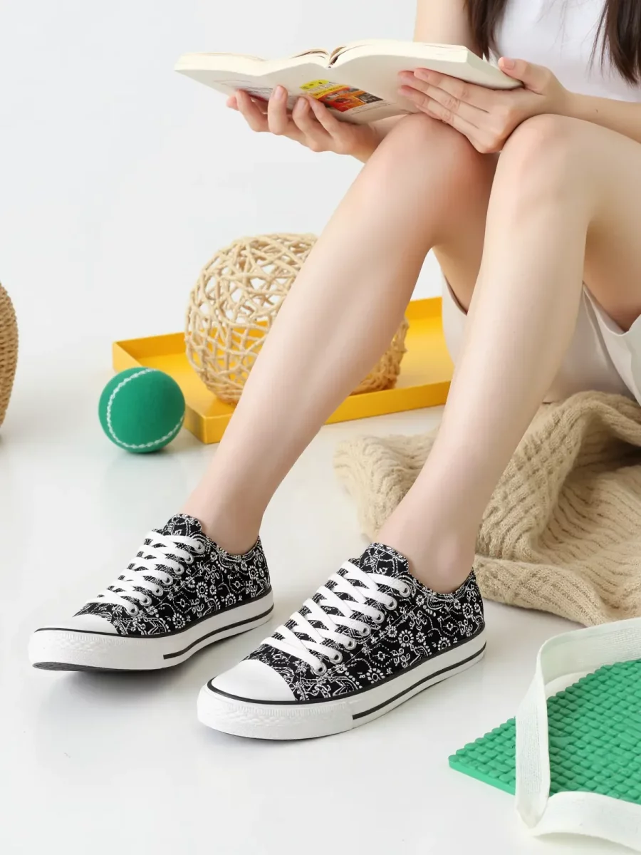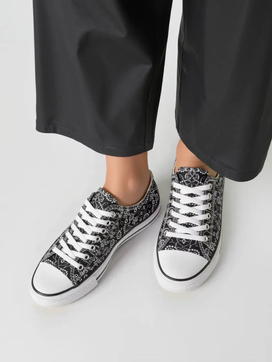 Damskie trampki BANDANA BLACK to wyjątkowe połączenie klasycznego fasonu z modnym wzorem bandany. Czarno-biała cholewka ozdobiona stylowym, paisleyowym nadrukiem nadaje butom oryginalny wygląd. Dzięki klasycznej gumowej podeszwie i sznurowanemu zapięciu model ten jest idealnym wyborem dla kobiet ceniących komfort i styl.