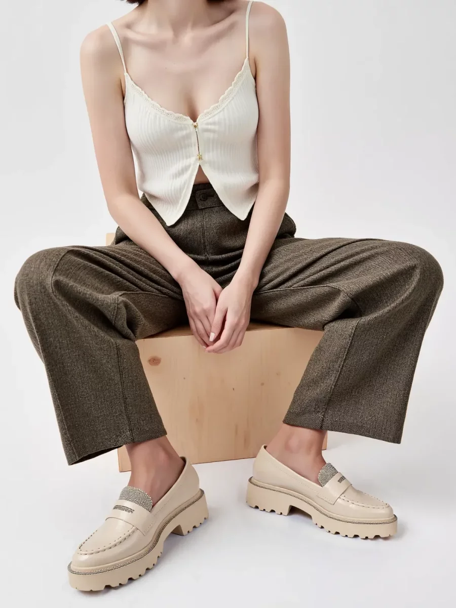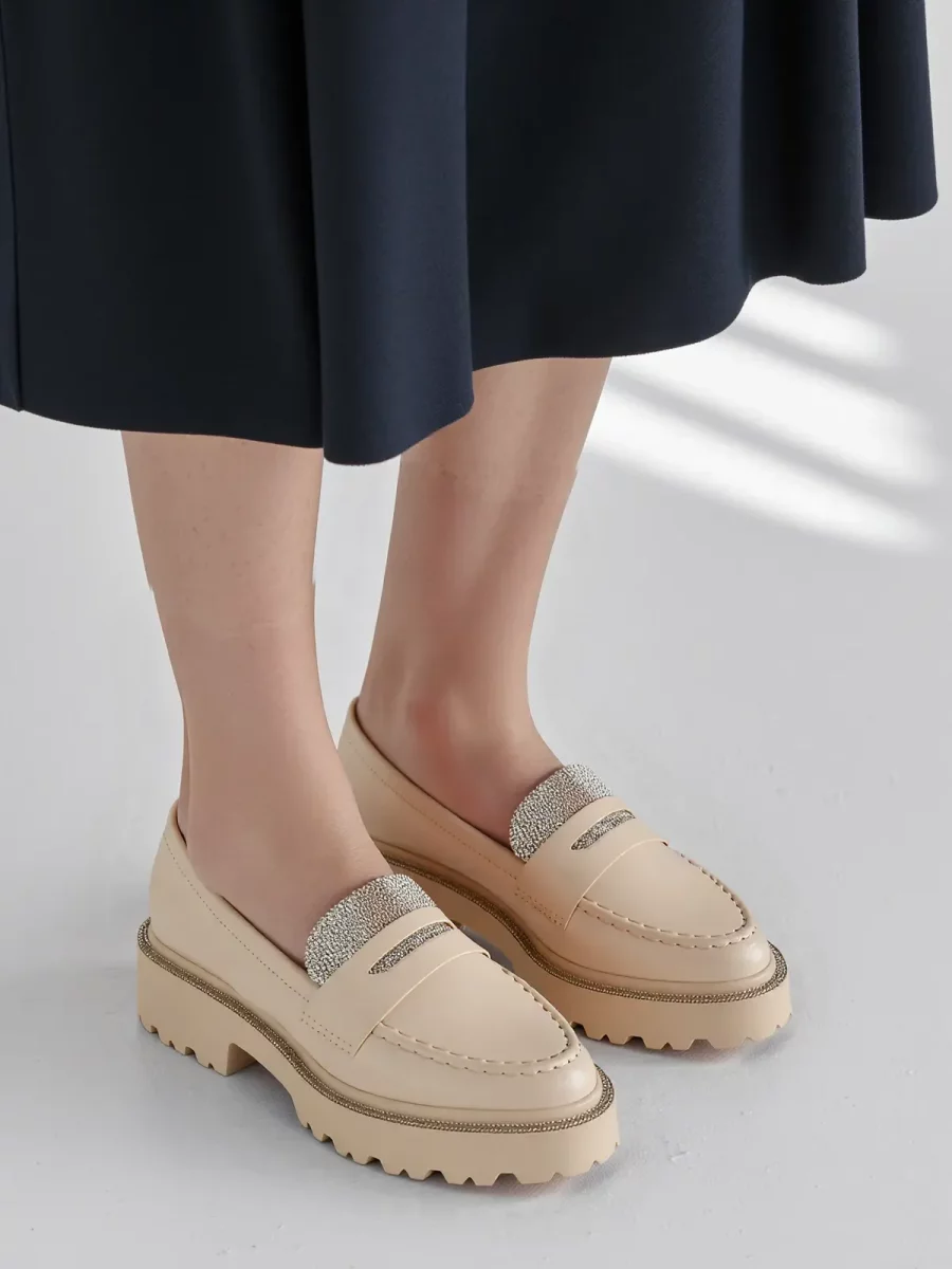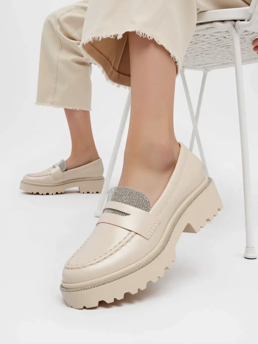 Damskie mokasyny LUCENTE BEIGE to elegancka propozycja dla kobiet ceniących styl i komfort. Wykonane z lakierowanej skóry ekologicznej w subtelnym beżowym odcieniu, nadają każdej stylizacji szyku i klasy. Ich wyjątkowym elementem są lśniące zdobienia na pasku oraz wokół podeszwy, które dodają im ekskluzywnego charakteru. Stabilna platforma z głębokim bieżnikiem zapewnia wygodę i pewność kroków przez cały dzień.