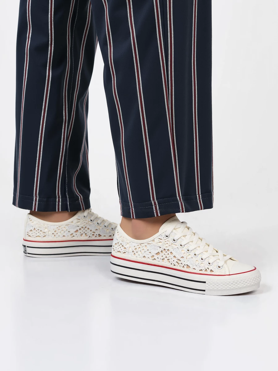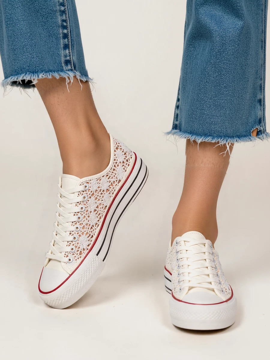 Damskie trampki BANDANA WHITE to wyjątkowe połączenie klasycznego fasonu z modnym wzorem bandany. Biała cholewka ozdobiona stylowym, paisleyowym nadrukiem nadaje butom oryginalny wygląd. Dzięki klasycznej gumowej podeszwie i sznurowanemu zapięciu model ten jest idealnym wyborem dla kobiet ceniących komfort i styl.