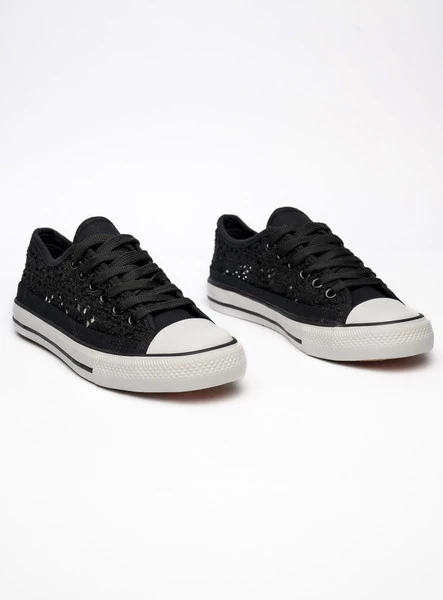 Damskie trampki BANDANA BLACK to wyjątkowe połączenie klasycznego fasonu z modnym wzorem bandany. Czarna cholewka ozdobiona stylowym, paisleyowym nadrukiem nadaje butom oryginalny wygląd. Dzięki klasycznej gumowej podeszwie i sznurowanemu zapięciu model ten jest idealnym wyborem dla kobiet ceniących komfort i styl.