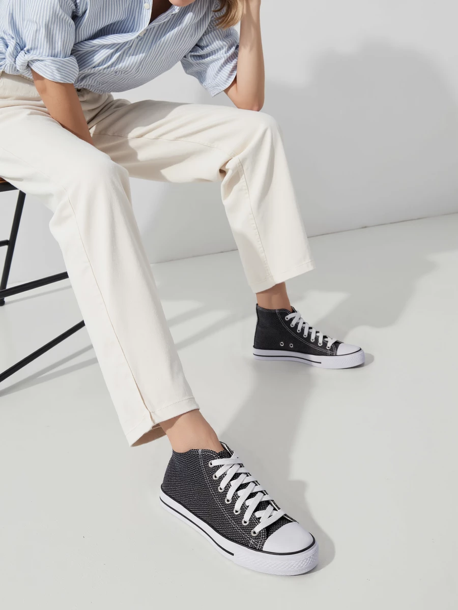 Damskie trampki CELVIA w kolorze czarnym to idealne połączenie klasyki i nowoczesności. Model wyróżnia się eleganckim połyskiem na cholewce oraz kontrastową linią na podeszwie, co dodaje mu unikalnego stylu. Wygodne i lekkie, doskonałe do codziennych stylizacji.