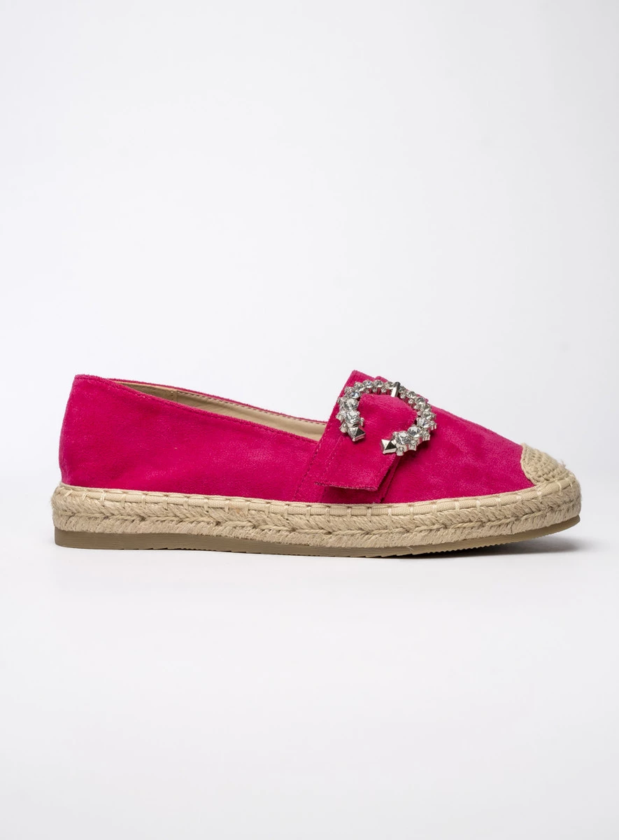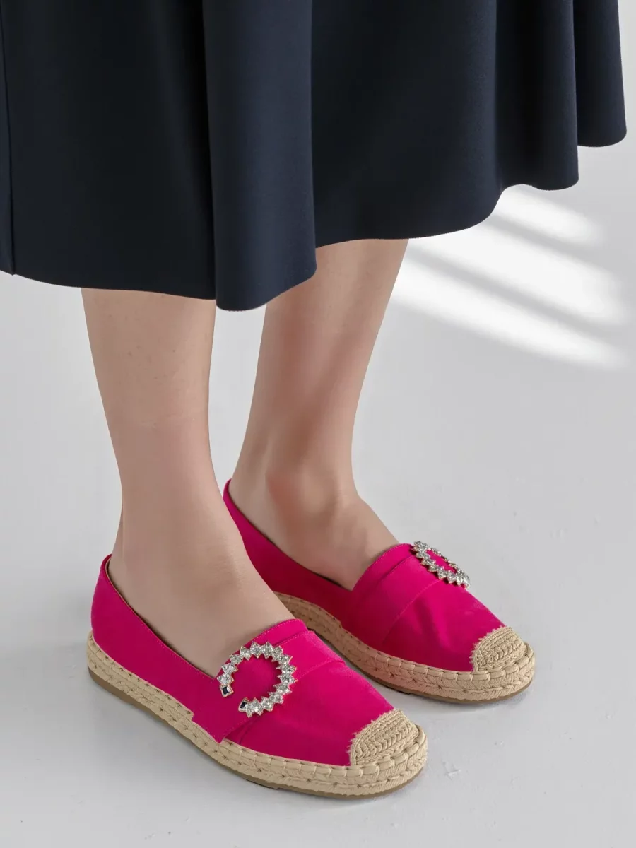 Damskie espadryle LUNARA FUCHSIA to połączenie wygody i elegancji w letnim wydaniu. Intensywny kolor fuksji nadaje im wyjątkowego charakteru, a ozdobna aplikacja z cyrkonii dodaje subtelnego blasku. Naturalna jutowa podeszwa podkreśla wakacyjny styl, a miękka cholewka zapewnia komfort przez cały dzień. Wsuwany fason sprawia, że buty idealnie dopasowują się do stopy, gwarantując wygodę noszenia.