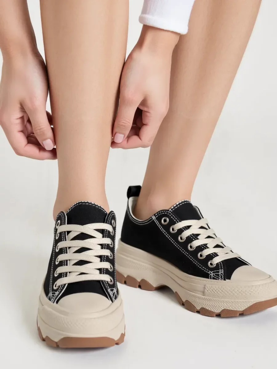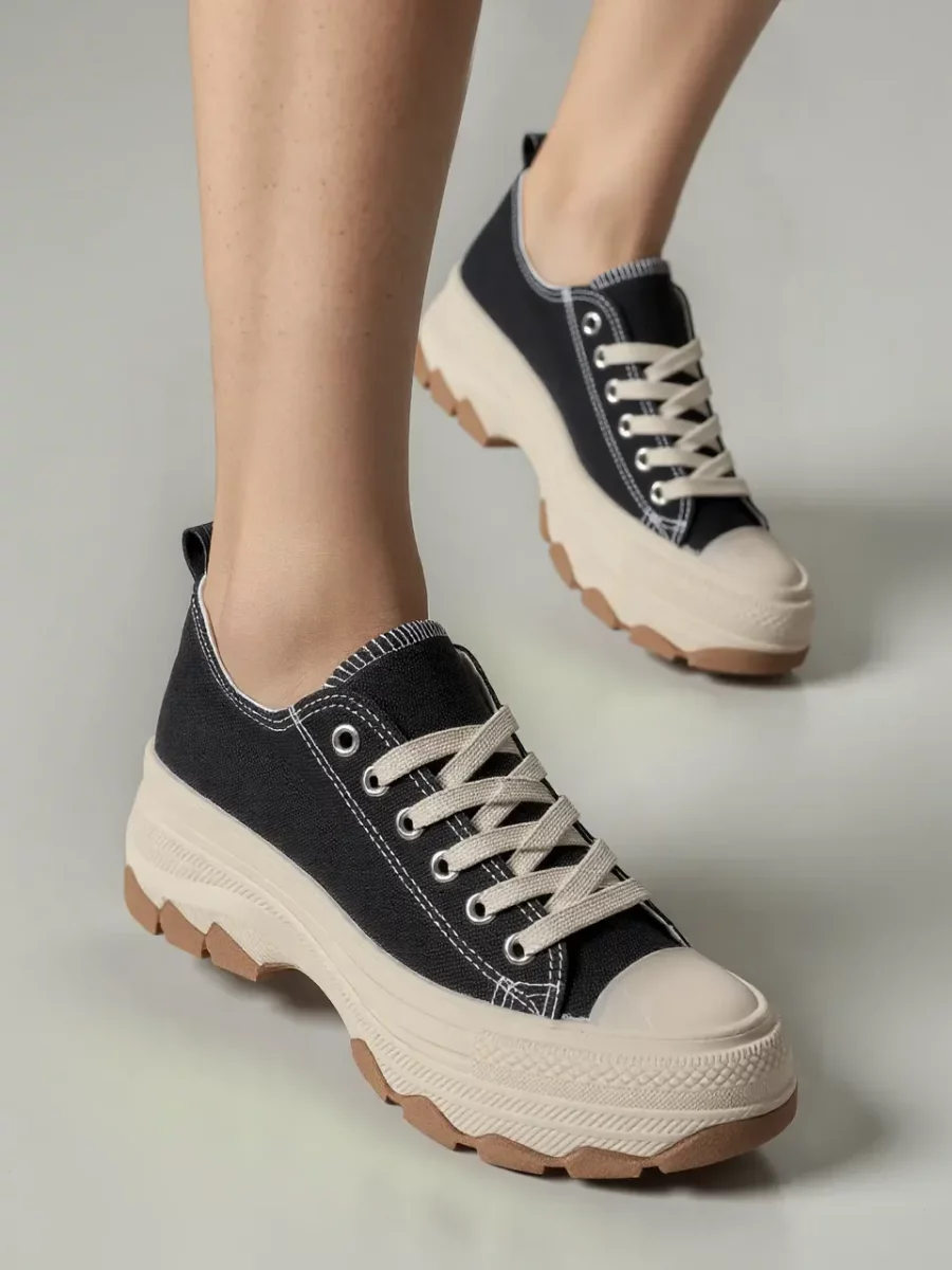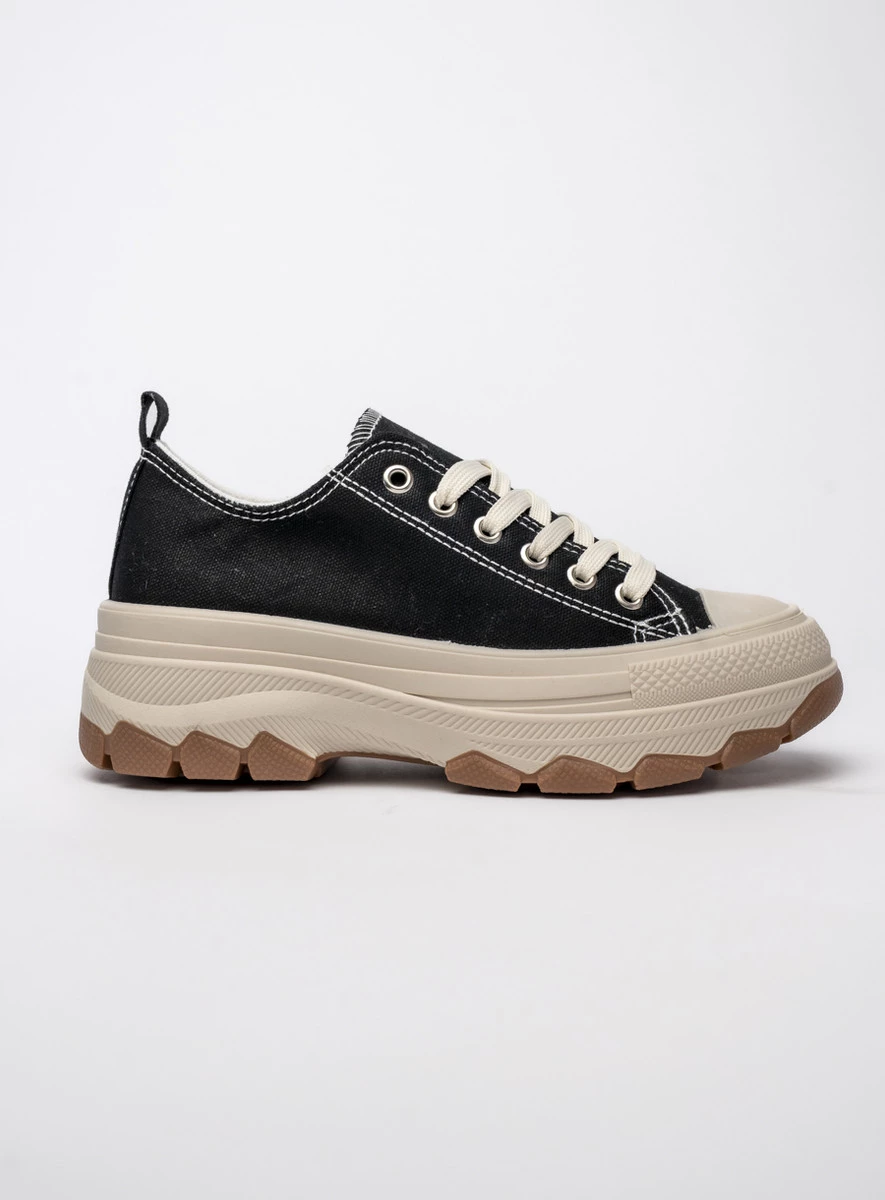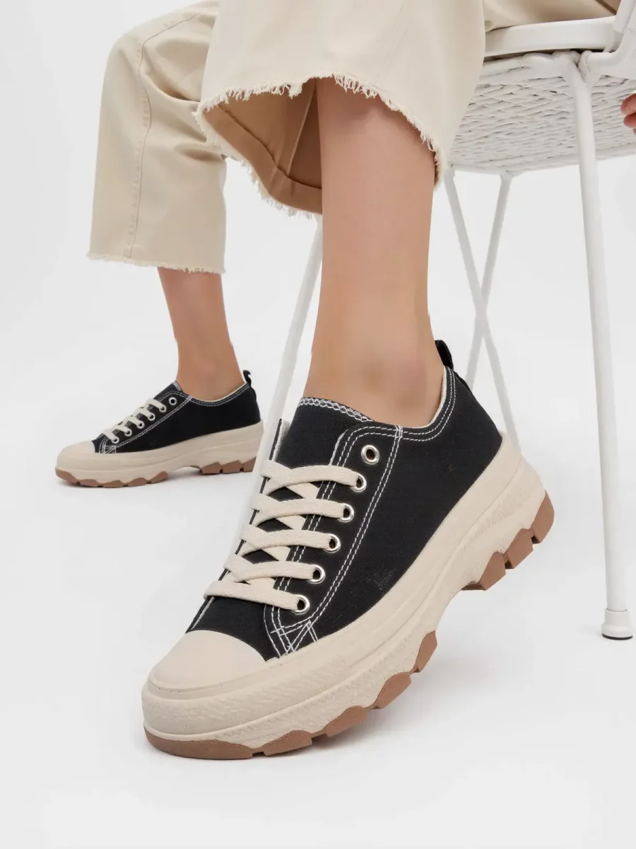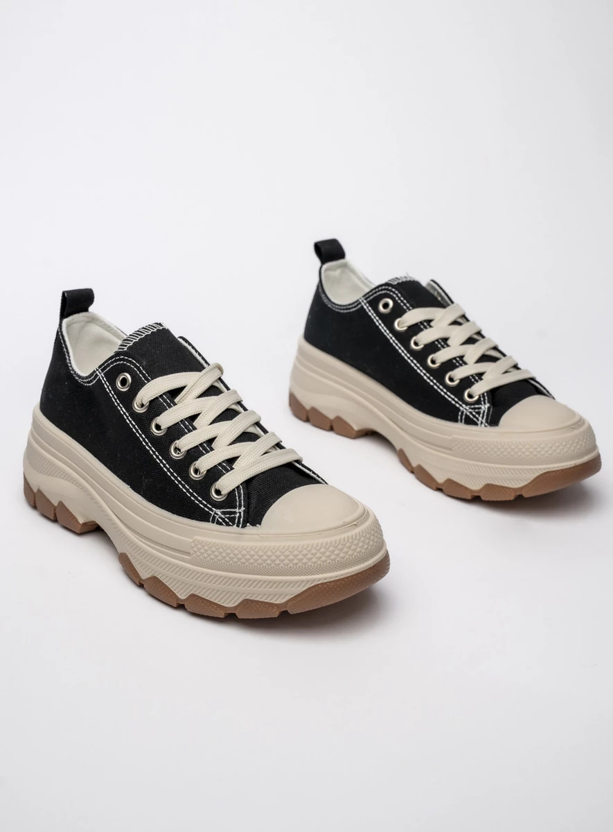 Nowoczesne damskie trampki STREVO BLACK w klasycznym czarnym kolorze z kontrastową podeszwą to idealne obuwie na co dzień. Ich minimalistyczny design w połączeniu z grubą, żłobioną podeszwą sprawia, że świetnie pasują do casualowych i streetwearowych stylizacji. Dzięki solidnej konstrukcji i wygodnej platformie zapewniają komfort noszenia przez cały dzień.