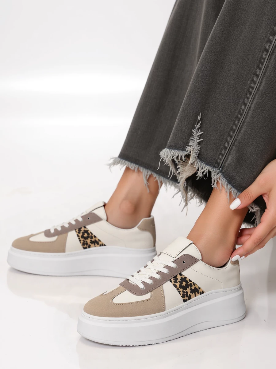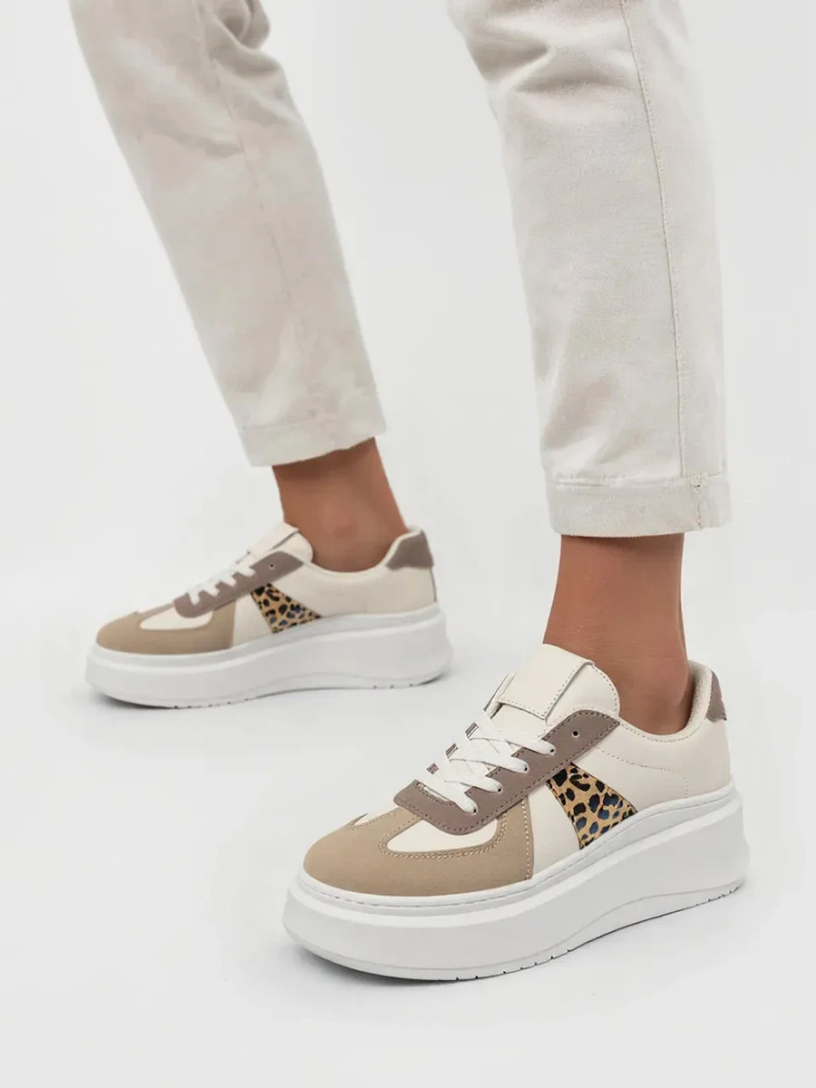 Wyrafinowane i modne damskie sneakersy CITY CHIC KHAKI łączą komfort z nowoczesnym designem. Charakteryzują się khaki kolorystyką z akcentami w odcieniach beżu oraz atrakcyjnym, leopardim printem, który dodaje odrobinę dzikości każdemu strojowi. Te buty są idealne zarówno do codziennych jak i bardziej zdecydowanych, miejskich stylizacji.