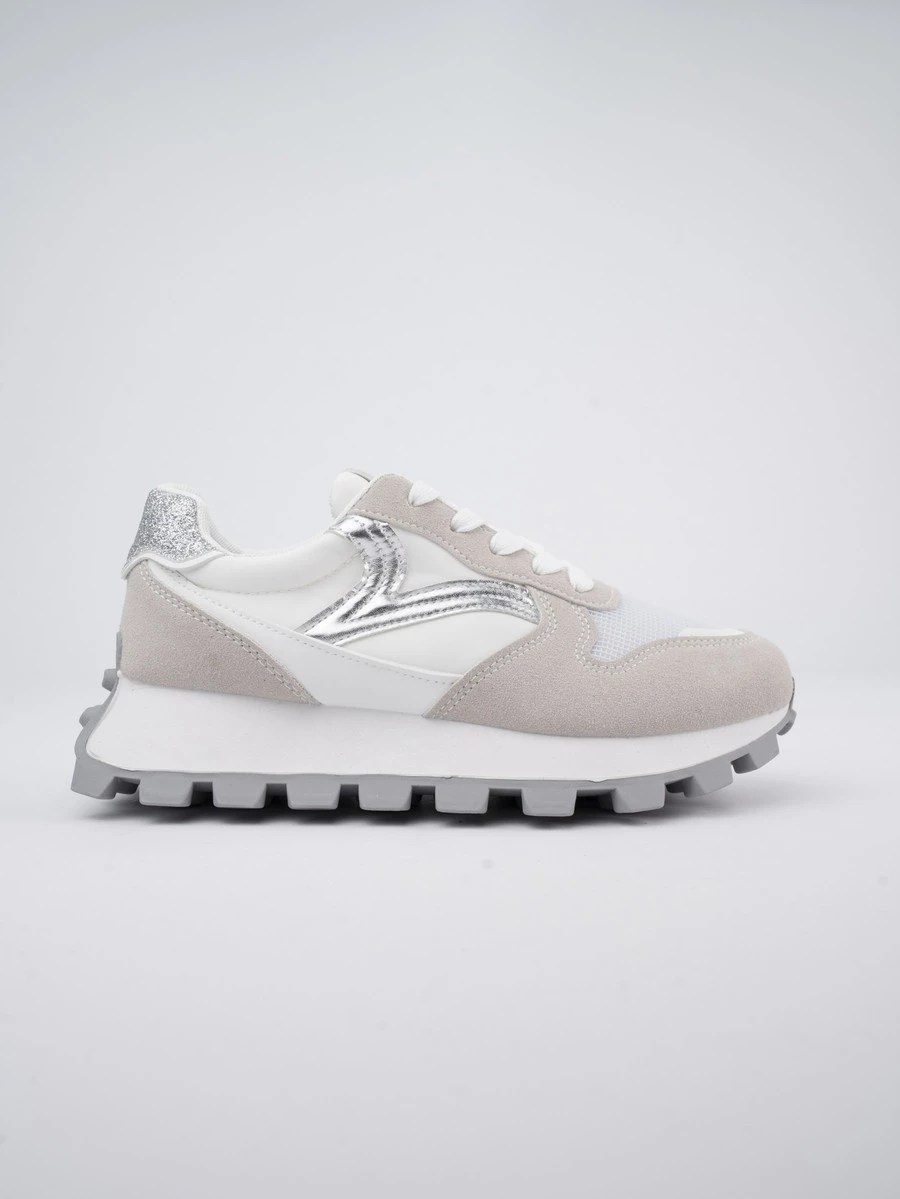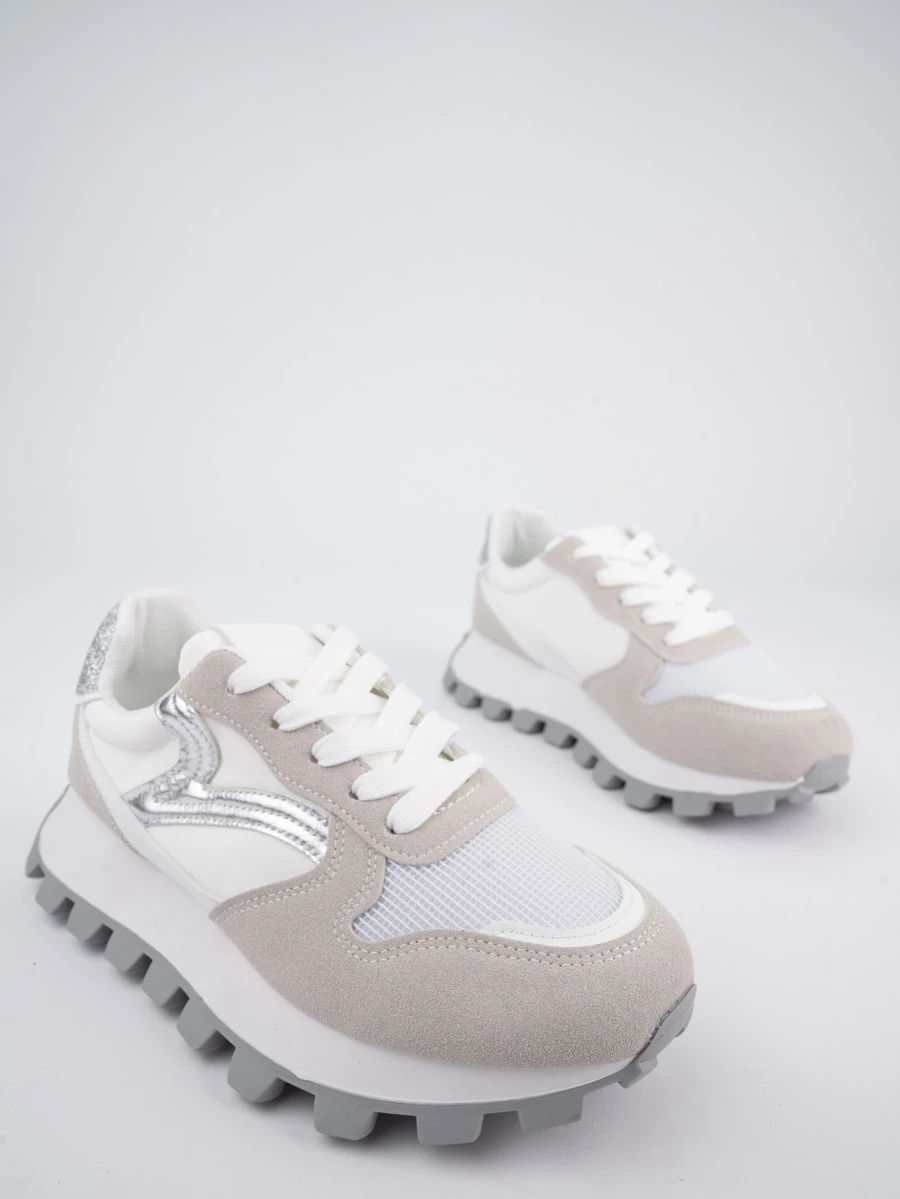 Damskie Sneakersy RAYA WHITE to harmonijne połączenie pastelowego beżu, bieli i połyskującego srebra. Cholewka z miękkiego zamszu ekologicznego, siateczki i metalicznych wstawek nie tylko zachwyca designem, ale także gwarantuje komfort i lekkość. Gruba, ząbkowana podeszwa w szarym kolorze zapewnia odpowiednią przyczepność i modny, masywny look. Idealne do miejskich stylizacji i codziennego noszenia.