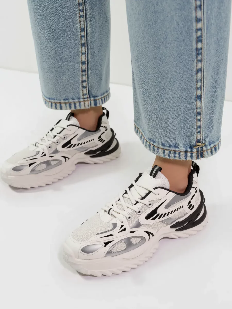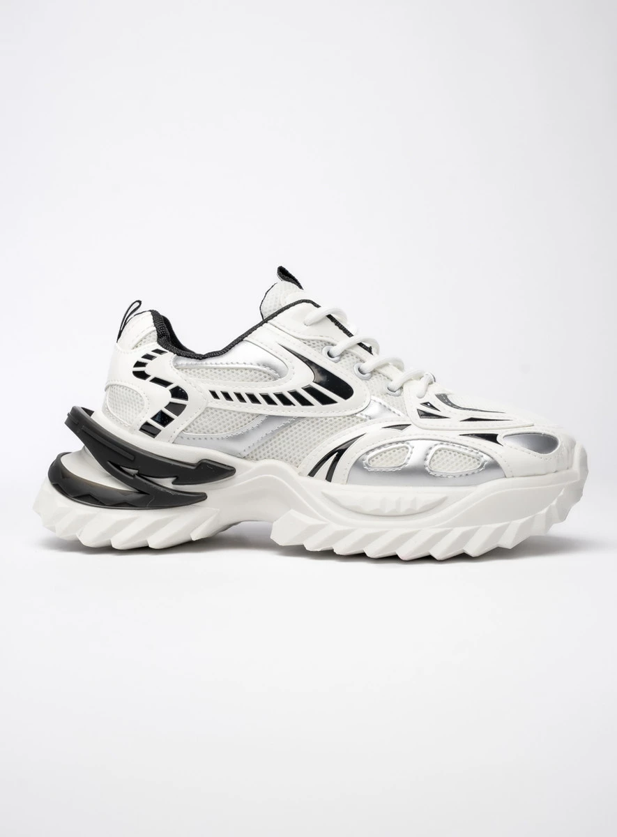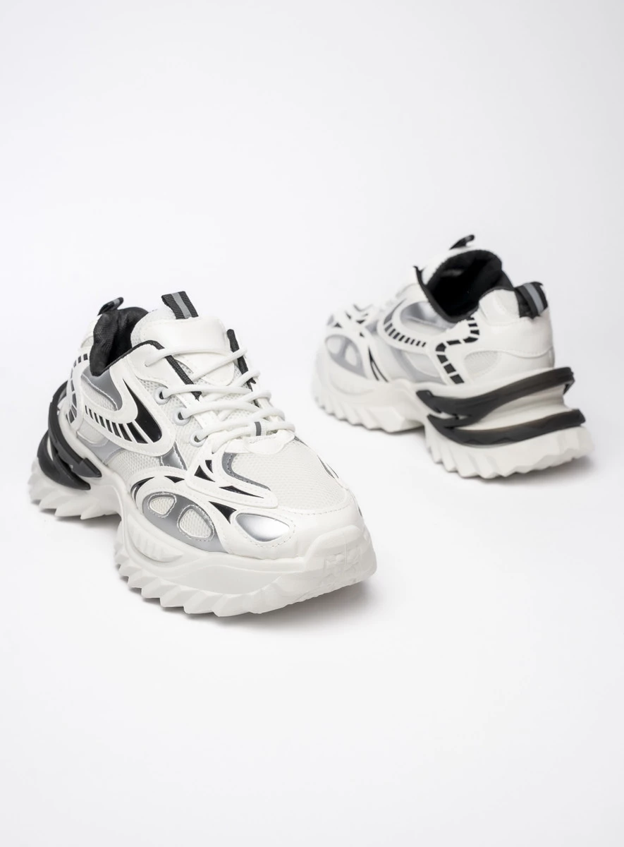 Futurystyczne i stylowe damskie sneakersy ZERON WHITE to propozycja dla kobiet, które szukają niebanalnego designu i maksymalnej wygody. Połączenie bieli, srebrnych i czarnych akcentów nadaje im dynamicznego wyglądu, a masywna podeszwa z unikalnymi detalami gwarantuje stabilność i amortyzację. Idealne zarówno do sportowych, jak i casualowych stylizacji.