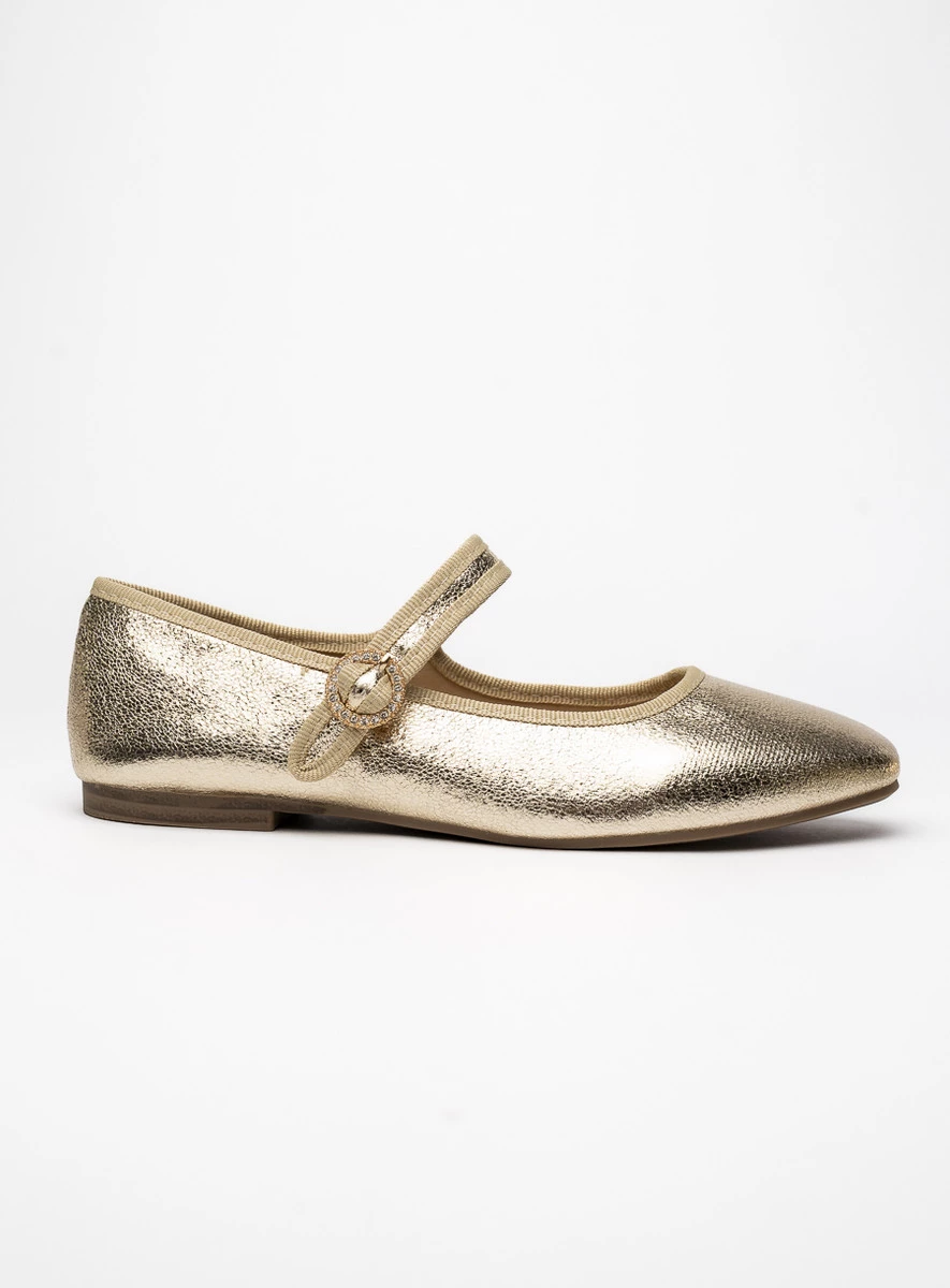 Baleriny VINTAGE CHARM w złotym kolorze to połączenie klasyki i elegancji. Wykonane z błyszczącej skóry ekologicznej, przyciągają uwagę swoim subtelnym połyskiem. Ozdobny pasek zapinany na klamrę dodaje im uroku i sprawia, że są doskonałym wyborem zarówno na co dzień, jak i na wyjątkowe okazje.