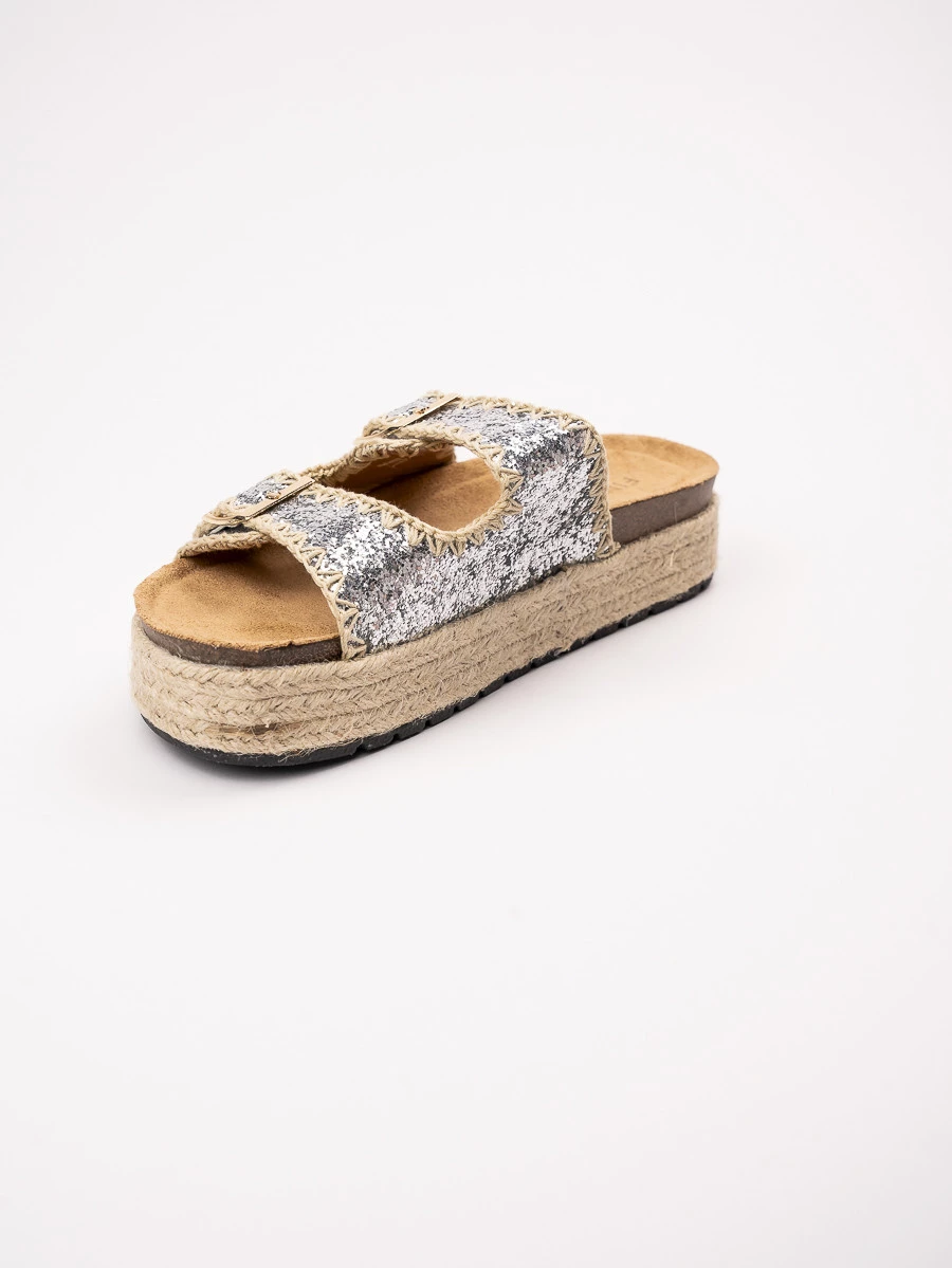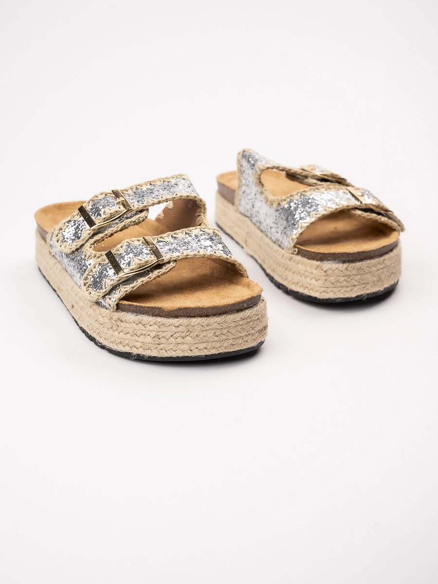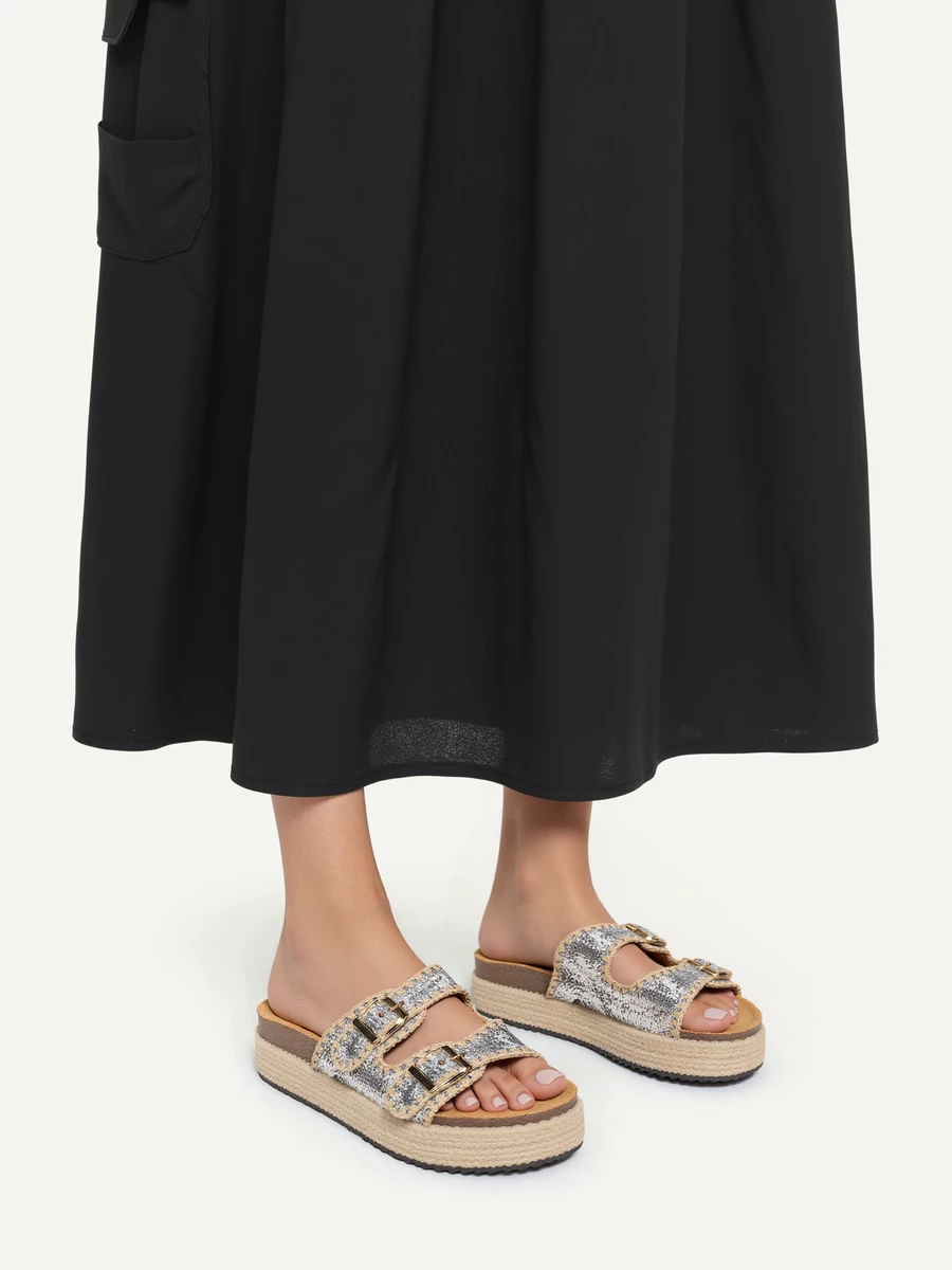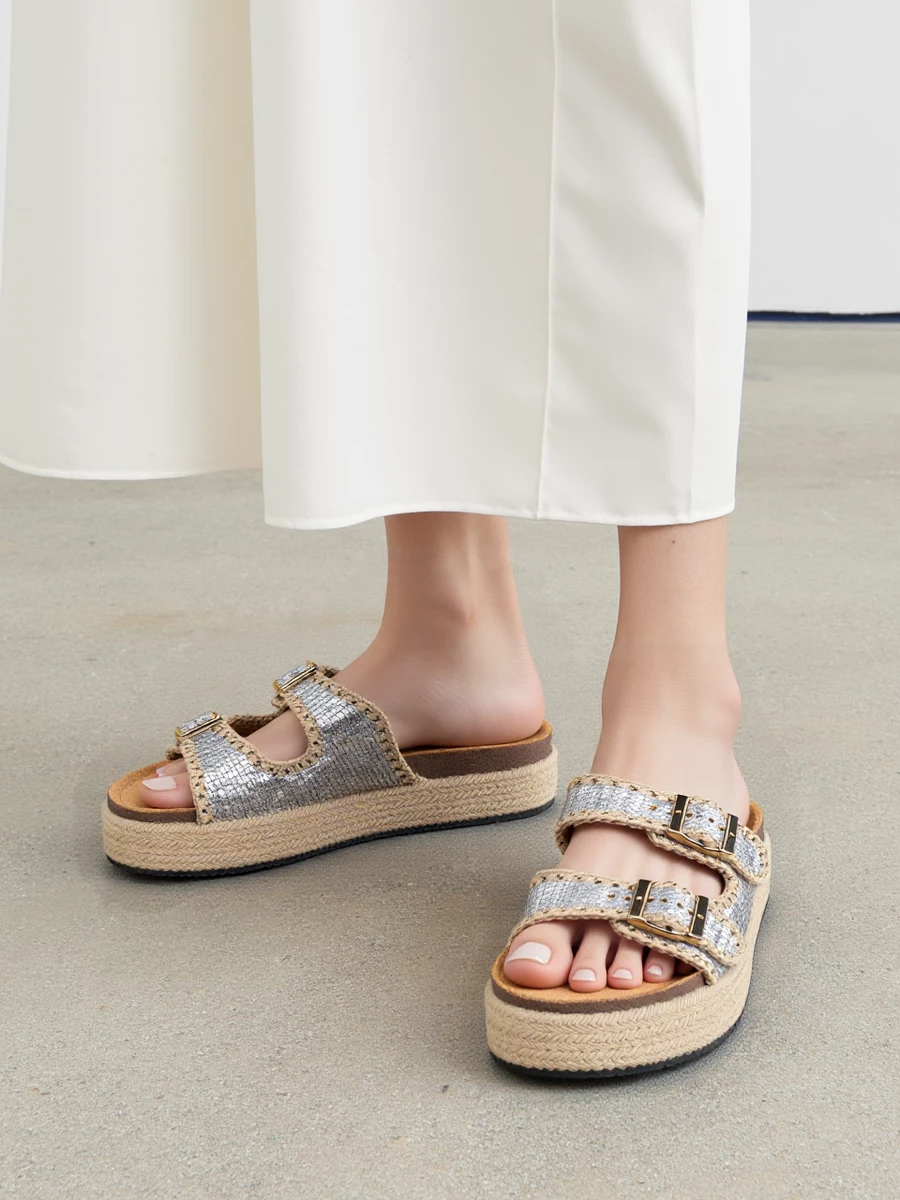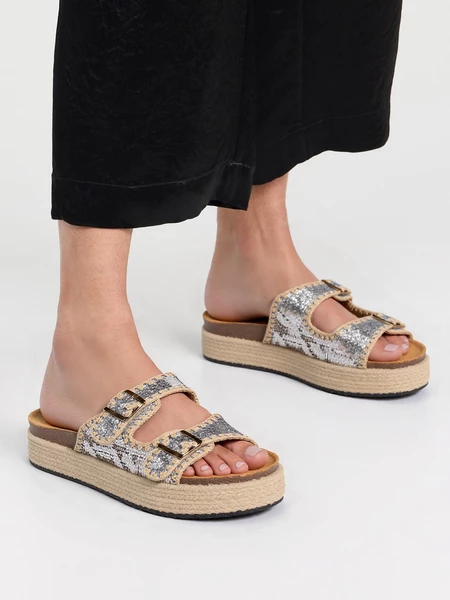 Odkryj klapki na koturnie z podwójnymi klamrami, które łączą w sobie wygodę i styl. Srebrne brokatowe wykończenie nadaje im wyjątkowego blasku, idealnego na letnie dni. Klapki posiadają plecioną platformę, która dodaje nie tylko wysokości, ale także nowoczesnego charakteru. Podwójne klamry zapewniają idealne dopasowanie do stopy, a solidna konstrukcja gwarantuje komfort noszenia przez cały dzień. Idealne do casualowych stylizacji, na plażę lub na miasto, te klapki staną się Twoim ulubionym letnim dodatkiem. Wybierz srebro, które nigdy nie wychodzi z mody w kolorze Silver.
