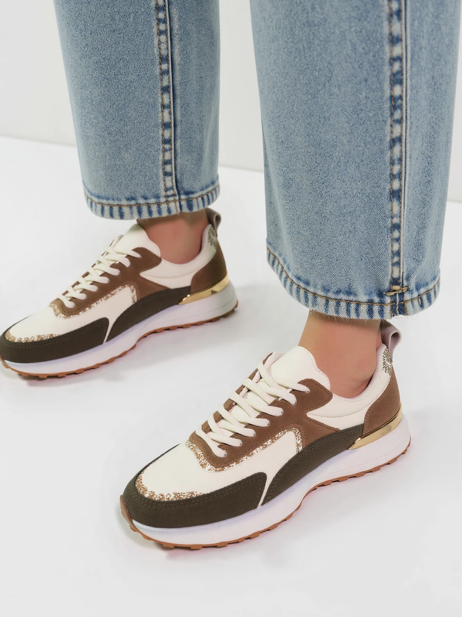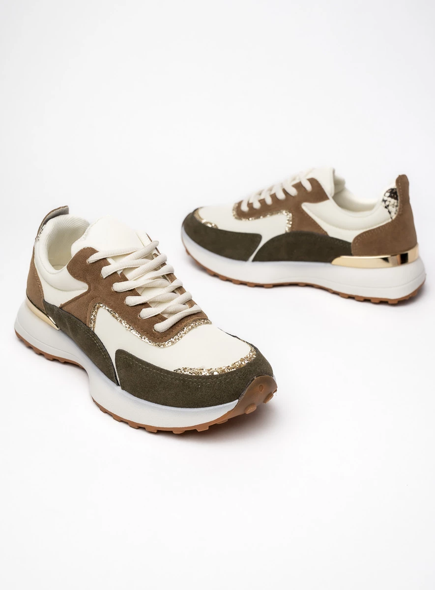 Damskie sneakersy WHITE ARMY GREEN to stylowe połączenie sportowego designu z modnym, militarnym akcentem. Kolorystyka inspirowana naturą, z dodatkiem złotych zdobień, sprawia, że buty doskonale pasują zarówno do casualowych, jak i bardziej wyrazistych stylizacji.