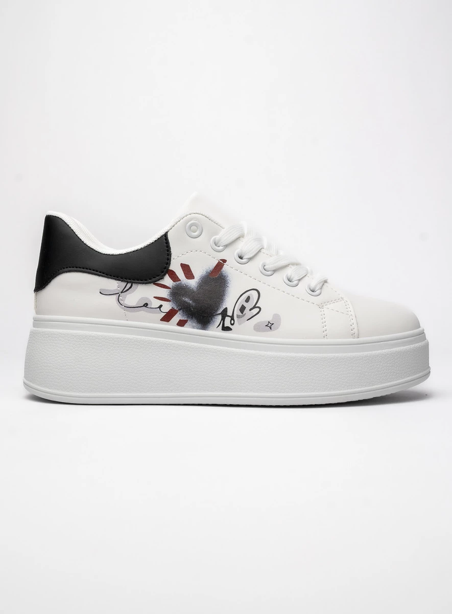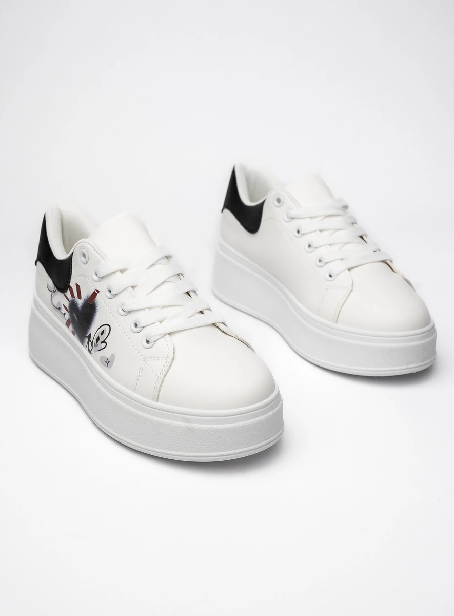Damskie sneakersy LUMIX BLACK to połączenie nowoczesnego stylu i wygody. Klasyczna biała cholewka ozdobiona unikalnym nadrukiem oraz kontrastowym czarnym detalem na pięcie nadaje butom wyjątkowego charakteru. Podwyższona, solidna podeszwa gwarantuje komfort noszenia i subtelnie podkreśla sylwetkę. Klasyczne sznurowanie zapewnia idealne dopasowanie, a uniwersalny design sprawia, że sneakersy świetnie komponują się zarówno z codziennymi, jak i streetwearowymi stylizacjami.