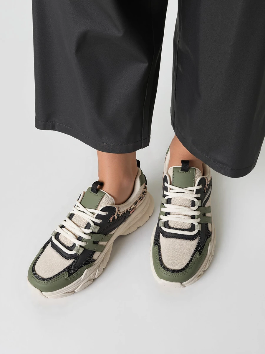 VEGA Black to nowoczesne sneakersy na grubej podeszwie, które łączą sportowy komfort z modnym designem. Unikalne połączenie zieleni, czerni i beżu z akcentami panterki dodaje im wyjątkowego charakteru i sprawia, że wyróżniają się na tle klasycznych modeli.