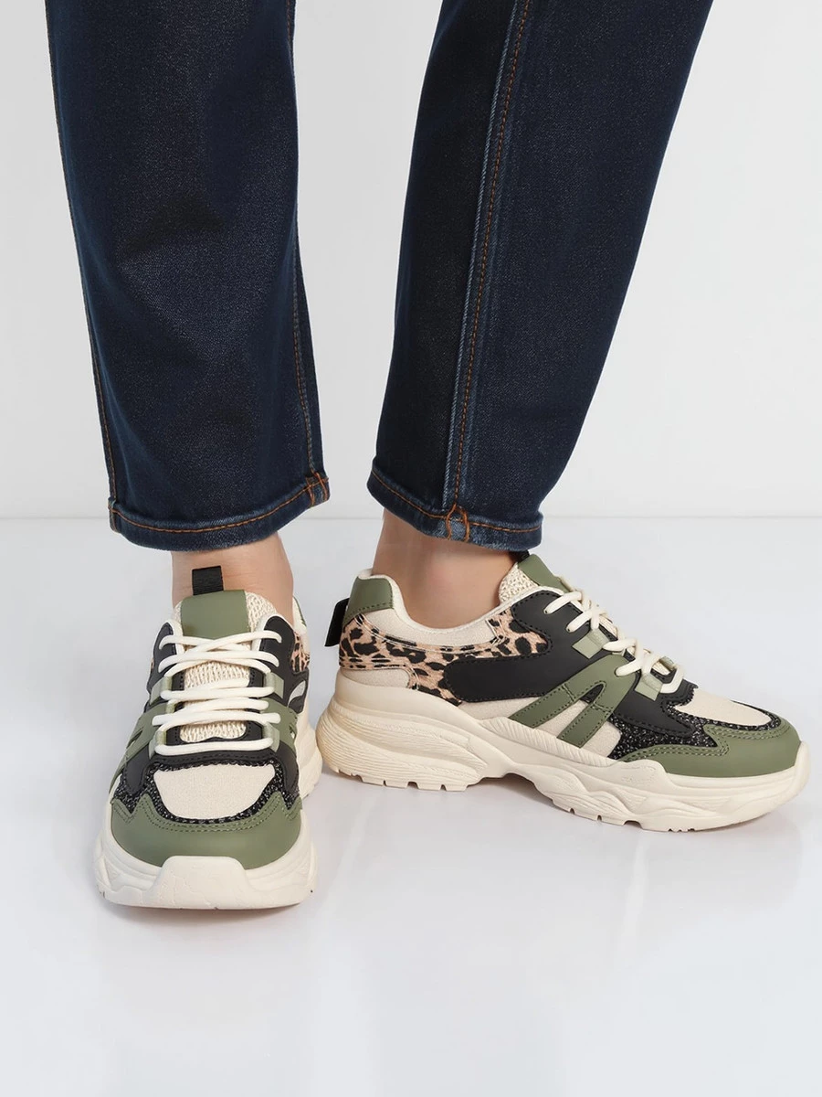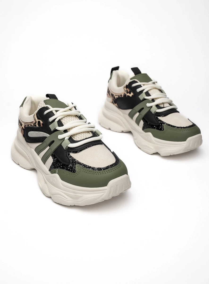 VEGA Black to nowoczesne sneakersy na grubej podeszwie, które łączą sportowy komfort z modnym designem. Unikalne połączenie zieleni, czerni i beżu z akcentami panterki dodaje im wyjątkowego charakteru i sprawia, że wyróżniają się na tle klasycznych modeli.