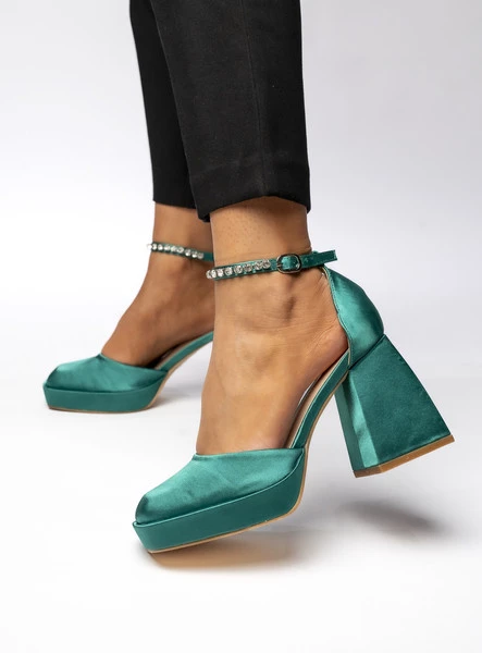 EMERIS Green to wyjątkowe czółenka na stabilnym słupku, które zachwycają satynowym wykończeniem i eleganckim paskiem zdobionym kryształkami. To idealny wybór dla kobiet ceniących luksusowy styl i wygodę.