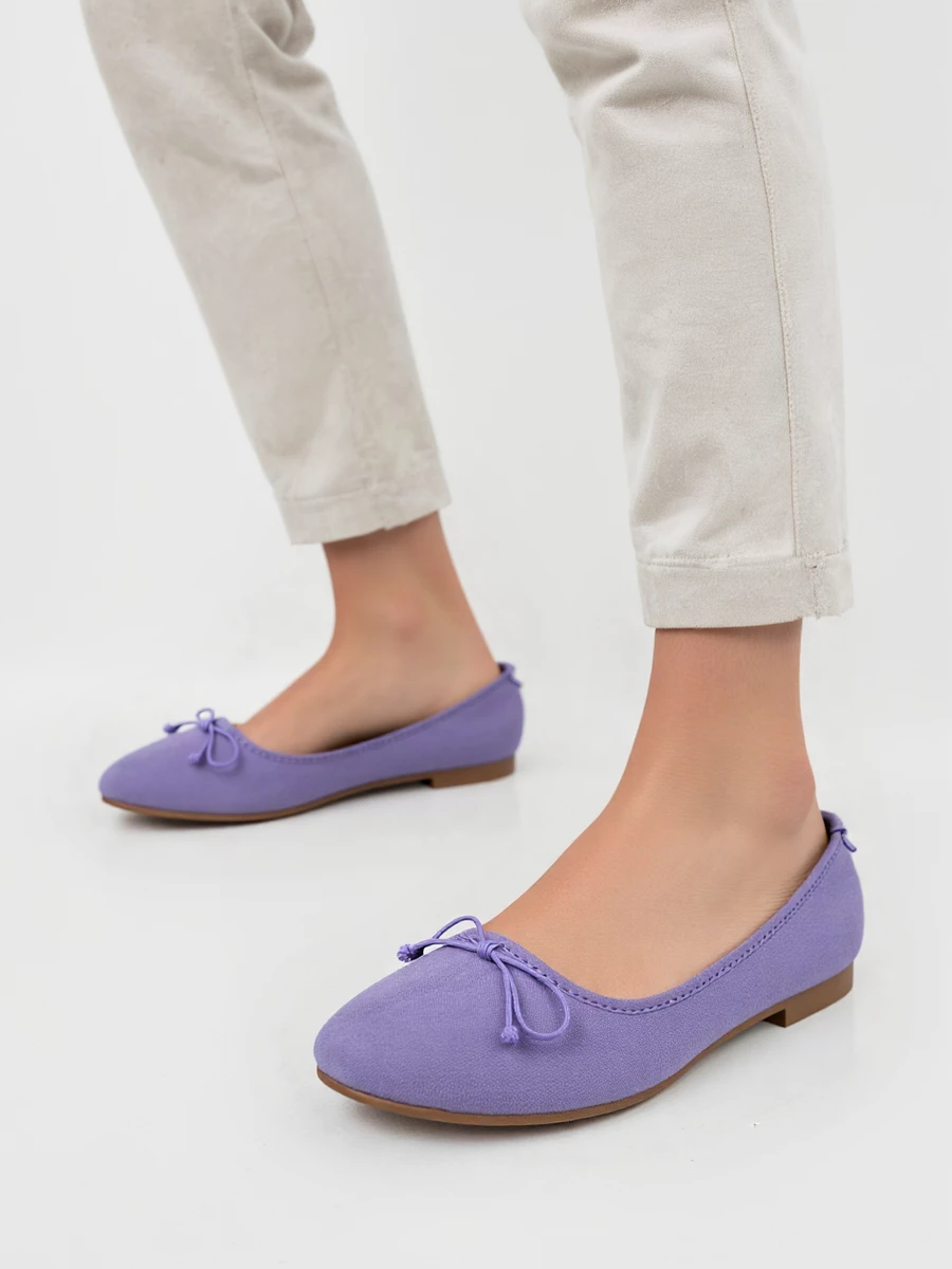 Damskie Baleriny BELLA PURPLE to połączenie wygody i subtelnego szyku. Ich głęboki, fioletowy kolor natychmiast przyciąga wzrok, ożywiając codzienne i bardziej eleganckie stylizacje. Delikatna kokardka z przodu dodaje dziewczęcego uroku, a płaska podeszwa oraz miękka cholewka zapewniają komfort noszenia przez cały dzień.