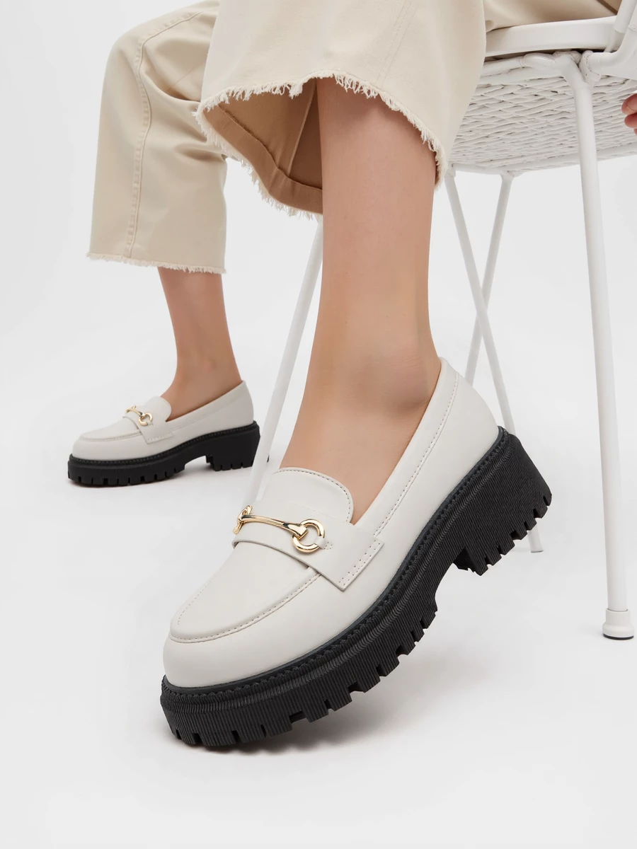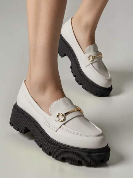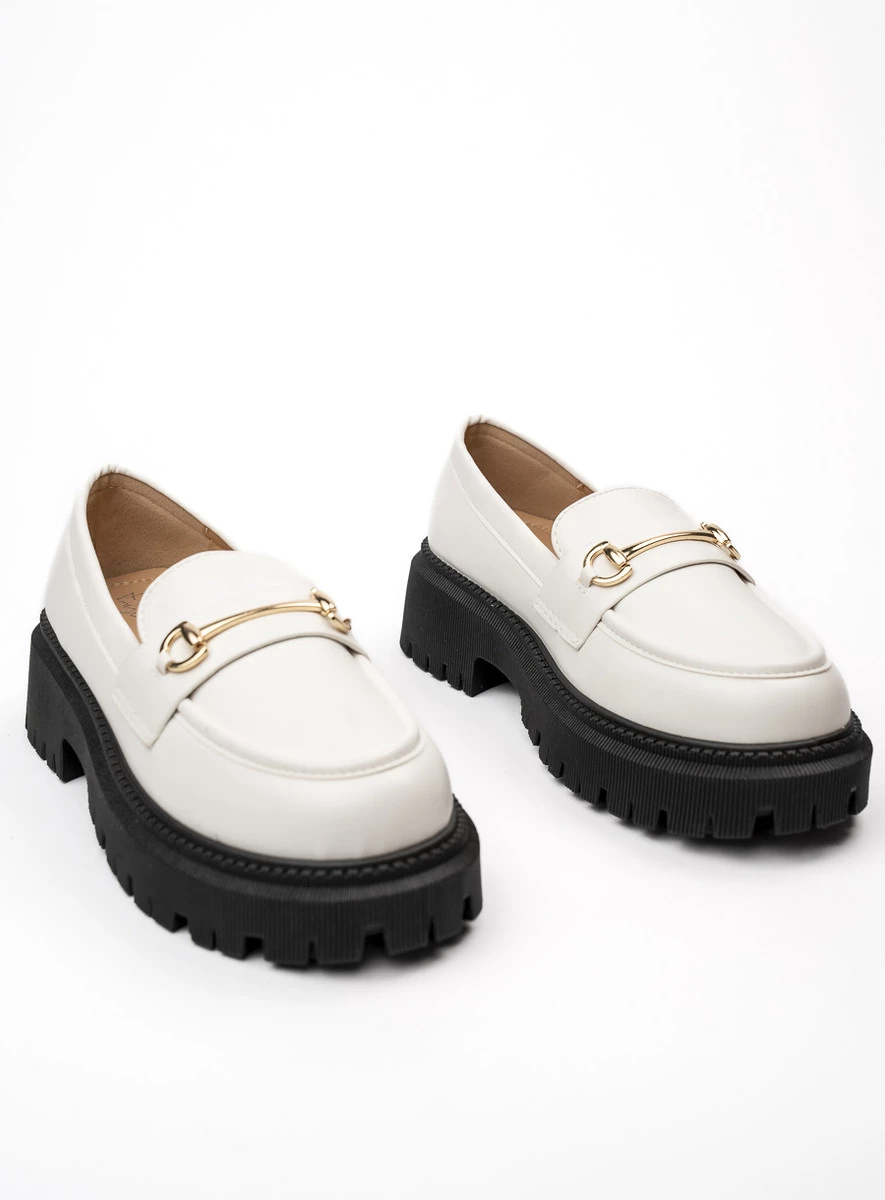 Damskie Mokasyny CARLA WHITE to idealne połączenie klasycznego fasonu z nowoczesnym akcentem. Gładka, biała cholewka z ekoskóry i złota ozdoba na podbiciu dodają butom szyku, dzięki czemu sprawdzą się zarówno w codziennych stylizacjach, jak i bardziej formalnych zestawach. Pogrubiona podeszwa zapewnia wygodę noszenia przez cały dzień, a wsuwana konstrukcja ułatwia szybkie zakładanie.