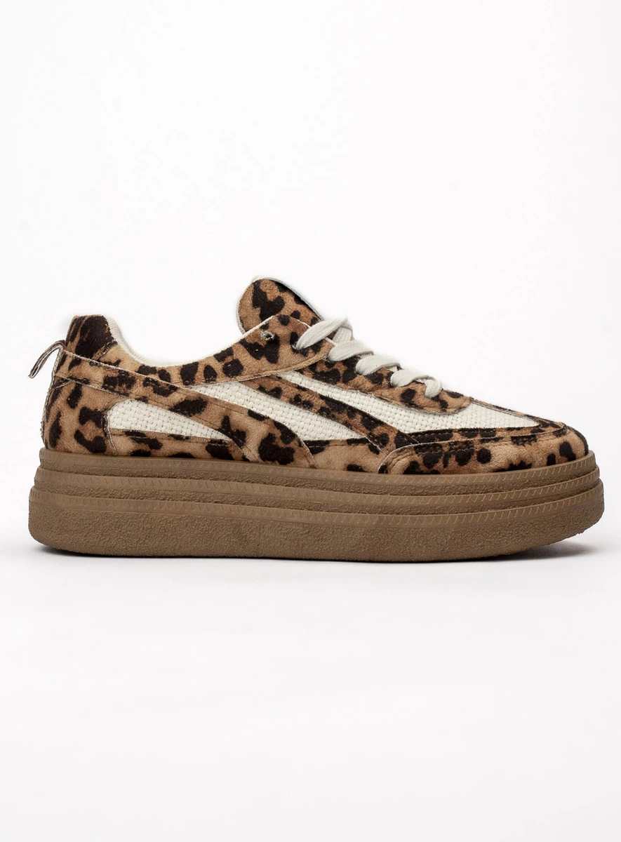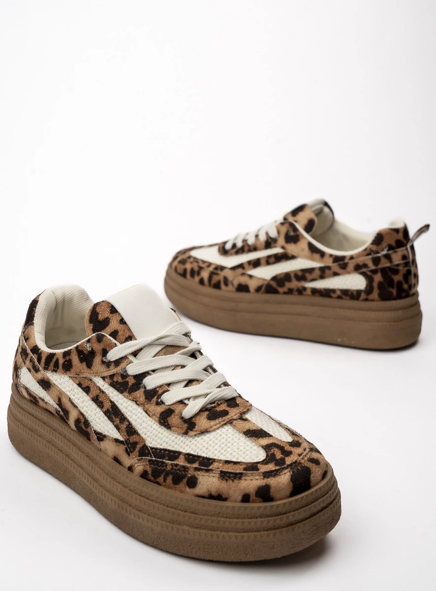Damskie Sneakersy MILA LEOPARD łączą w sobie odważny, cętkowany wzór z modną, brązową (gumową) podeszwą. Takie zestawienie nadaje butom oryginalnego charakteru, a podwyższona platforma sprawia, że sylwetka wydaje się smuklejsza. Wierzch wykonany z połączenia ekozamszu i ekoskóry zapewnia trwałość oraz komfort, a sznurowanie umożliwia idealne dopasowanie do stopy. To doskonały wybór dla kobiet ceniących miejski styl i wygodę w codziennych stylizacjach.