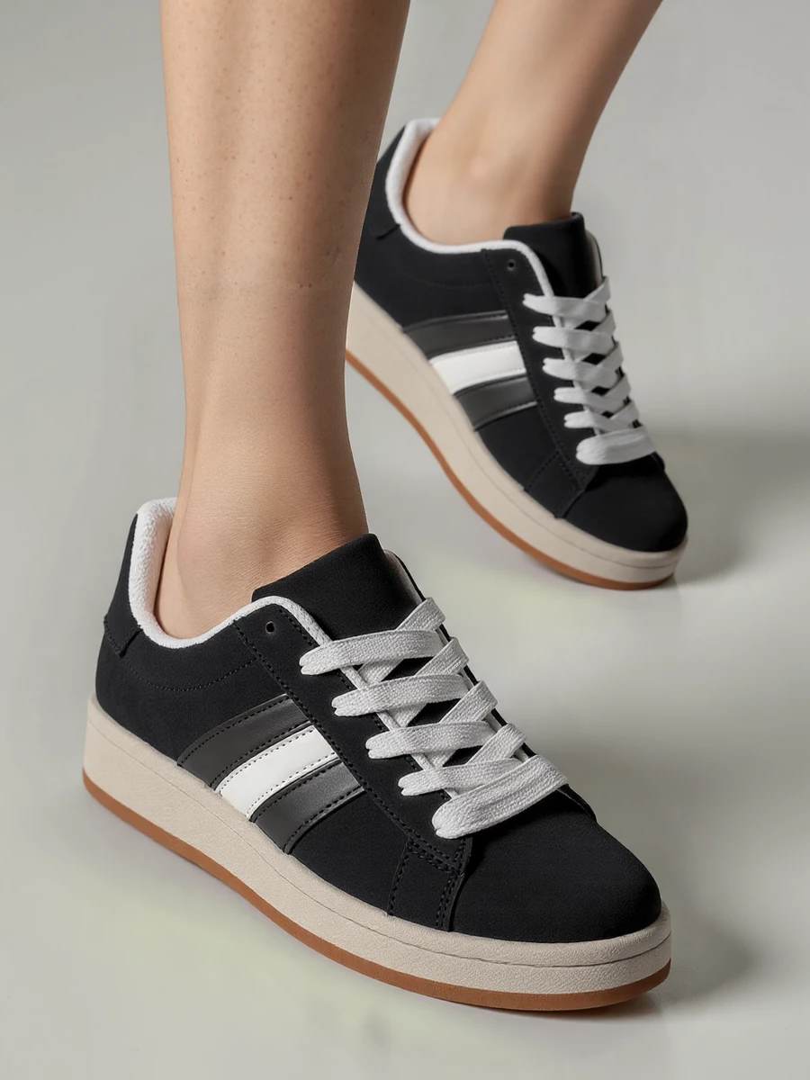 Damskie Sneakersy ADANIS BLACK to połączenie klasycznego, sportowego stylu z ponadczasowym czarnym kolorem. Wykonane z wytrzymałego materiału, zapewniają wygodę i doskonale sprawdzą się w codziennych stylizacjach – od jeansów, po sukienki. Kontrastujące, białe sznurowadła podkreślają sportowy charakter obuwia, a gumowa podeszwa dba o stabilność i komfort noszenia przez cały dzień.