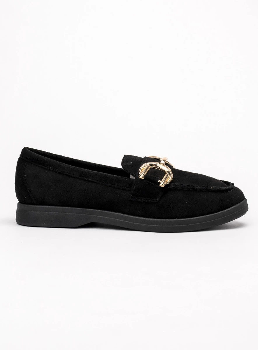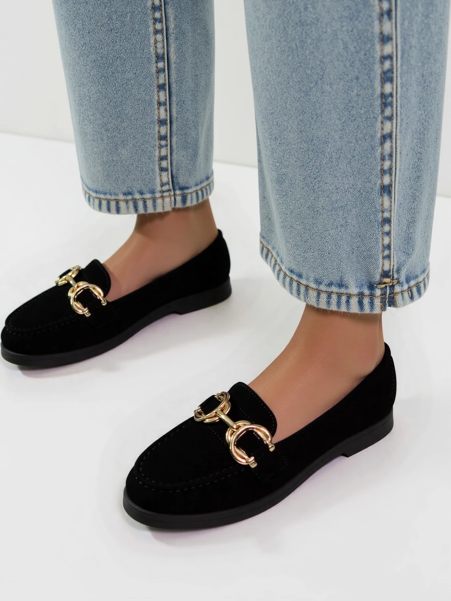 Damskie Mokasyny LUNA BLACK łączą ponadczasowy, czarny kolor z efektowną, złotą sprzączką na podbiciu. Wykonane z ekozamszu (lub materiału zamszopodobnego) przyciągają uwagę subtelnym połyskiem i miękką fakturą. Dzięki płaskiej podeszwie i wsuwanemu fasonowi buty są niezwykle wygodne, sprawdzając się zarówno w codziennych stylizacjach, jak i w nieco bardziej eleganckich zestawach.